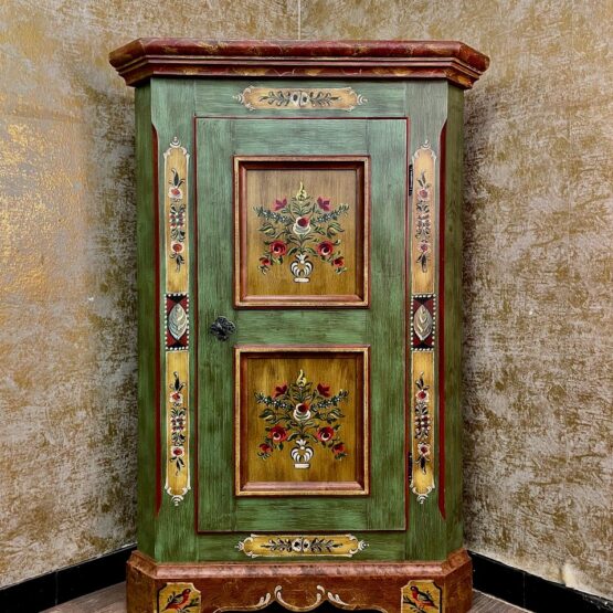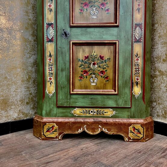 Die Tür des Eckschranks ist mit zwei floralen Motiven verziert, die von einem Passepartout eingerahmt werden und dem Schrank seinen einzigartigen, künstlerischen Charakter verleihen.