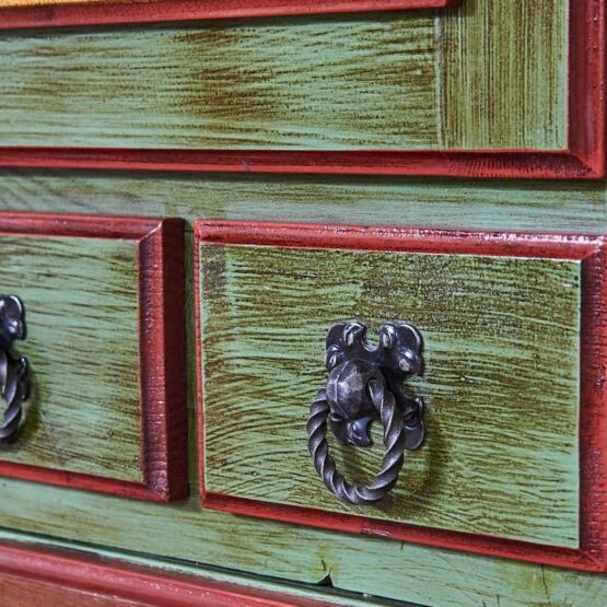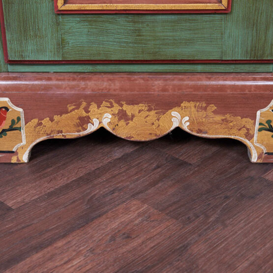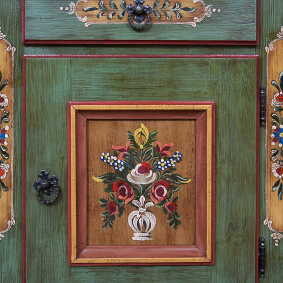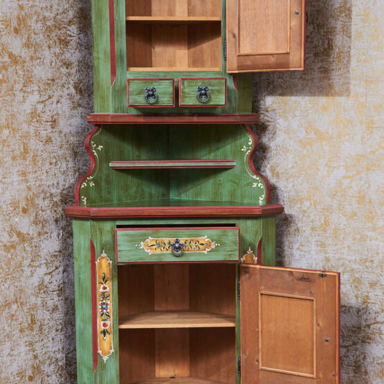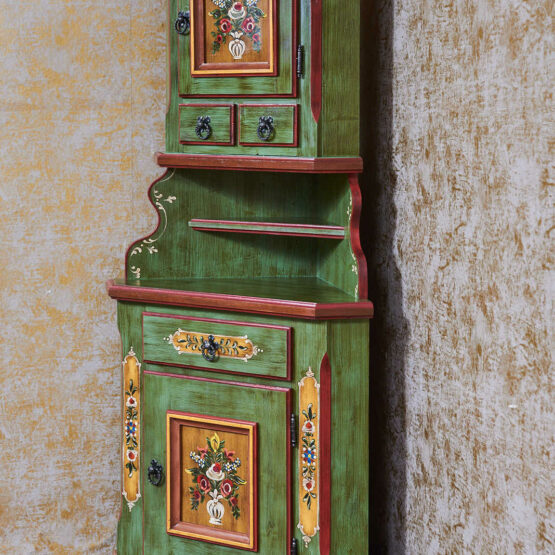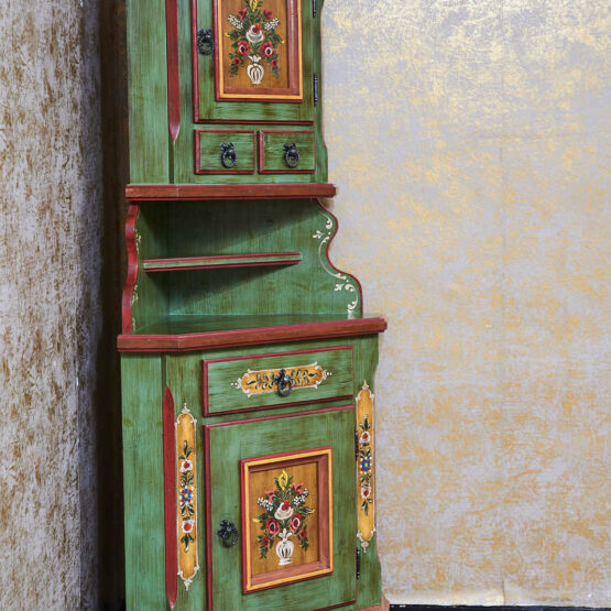 Die kunstvoll bemalten Türen mit floralen Motiven und die detailreichen Verzierungen verleihen diesem Eckschrank seinen unverwechselbaren Charakter. Ein Möbelstück, das sowohl praktisch als auch dekorativ ist und Ihrem Zuhause alpinen Charme verleiht.