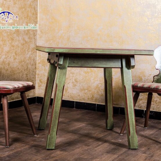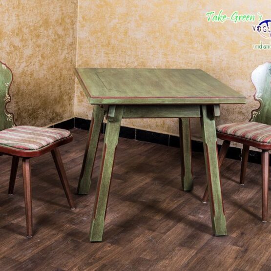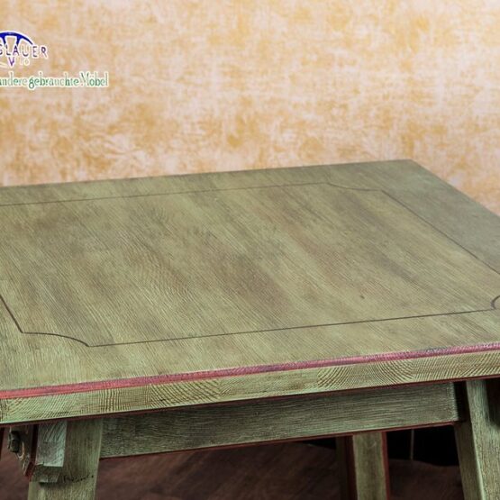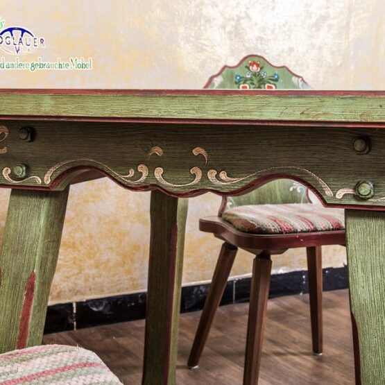 Gefertigt aus massivem Fichtenholz und liebevoll von Hand bemalt, erhält jedes Stück seine ganz eigene, unverwechselbare Note. Feine Verzierungen verleihen dem Tisch eine verspielte Eleganz, ohne dabei seine klare, rustikale Ausstrahlung zu verlieren.