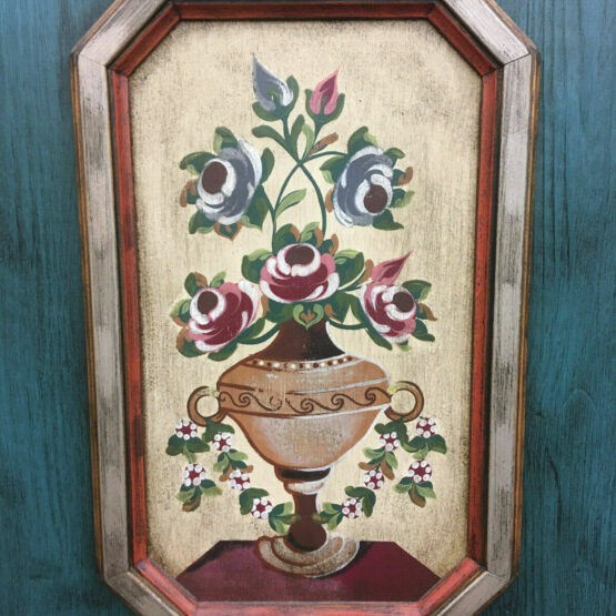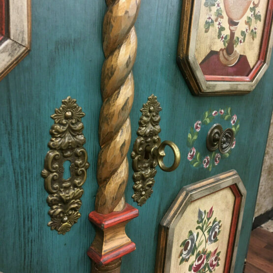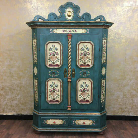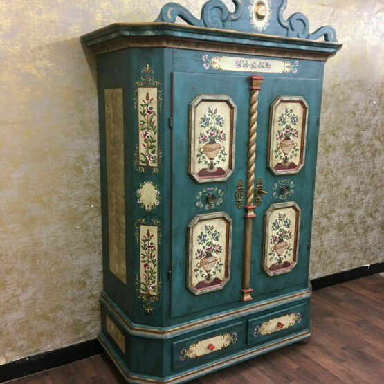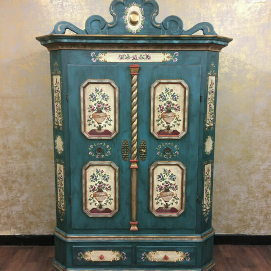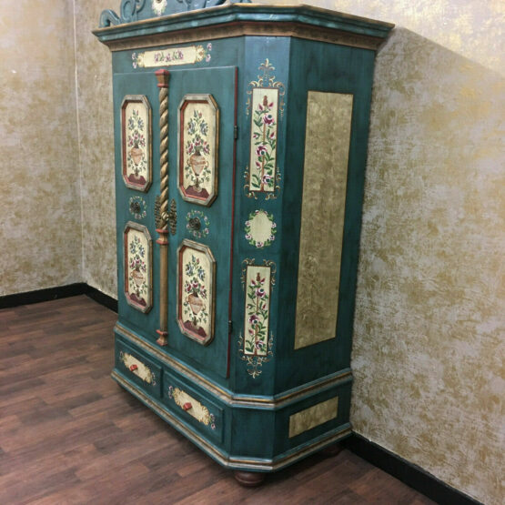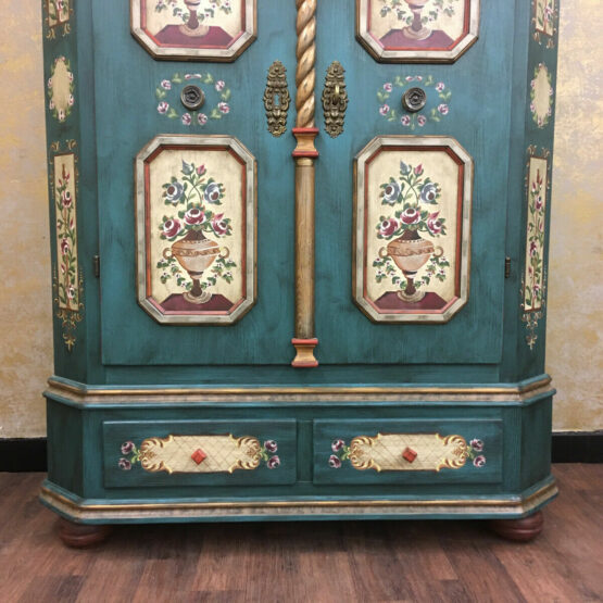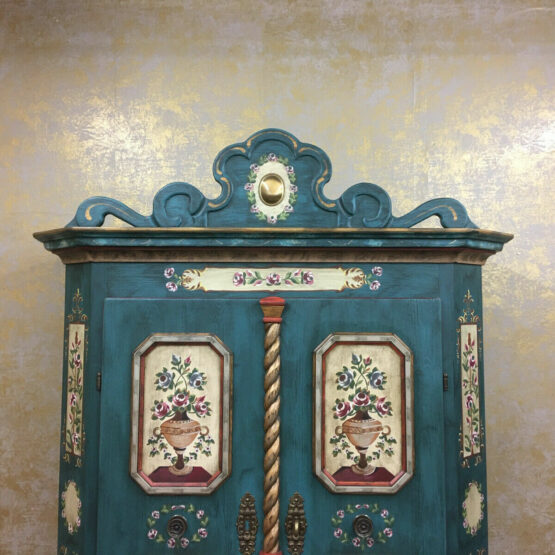 Der reich verzierte Zieraufsatz, die goldene Drechselsäule zwischen den Türen und die kunstvollen Blumenmotive auf tiefblauem Grund lassen sofort an ein alpenländisches Erbstück denken.