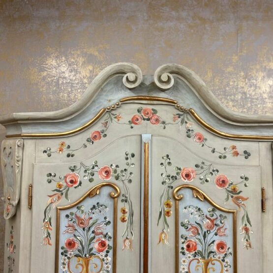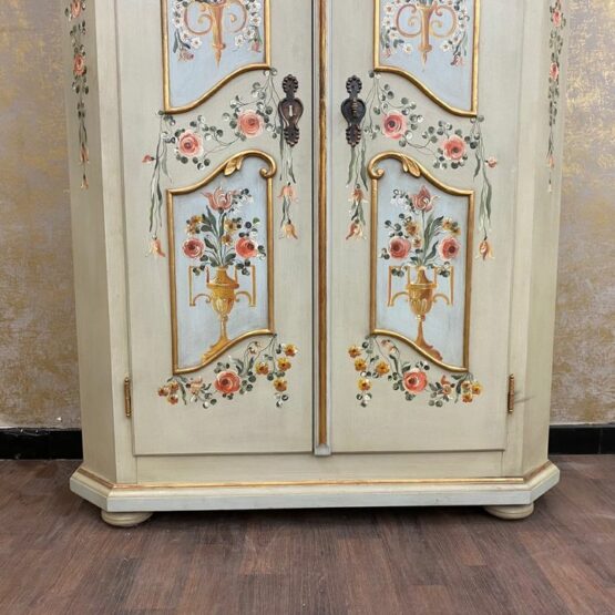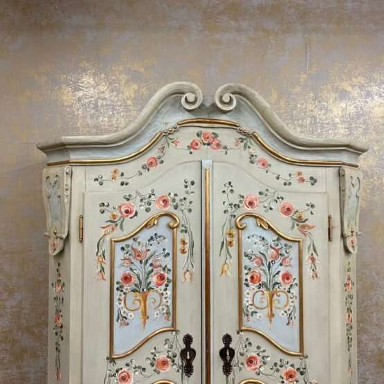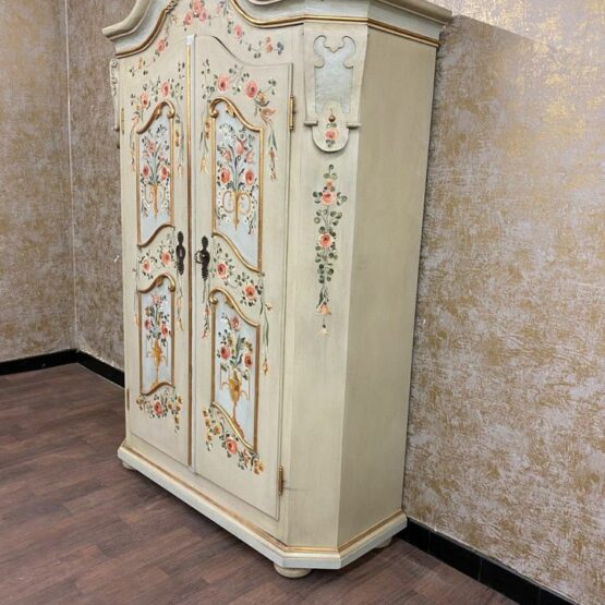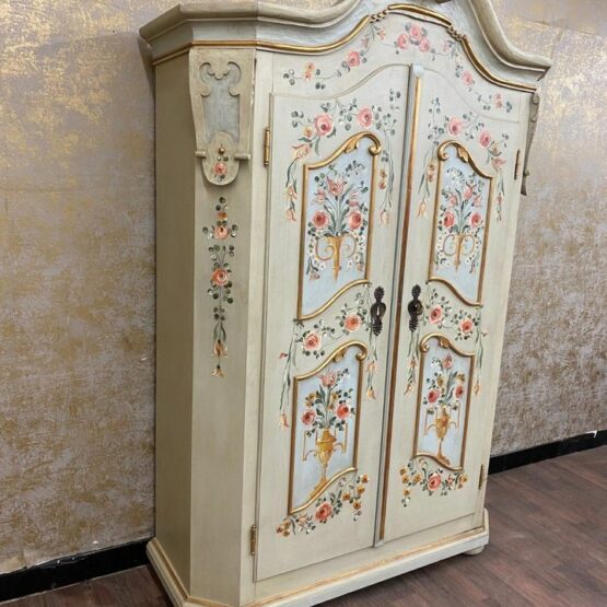 Dieser Haushaltsschrank glänzt mit detailverliebten Verzierungen. Der geräumige Schrank bietet viel Stauraum für Ihre persönlichen Schätze.