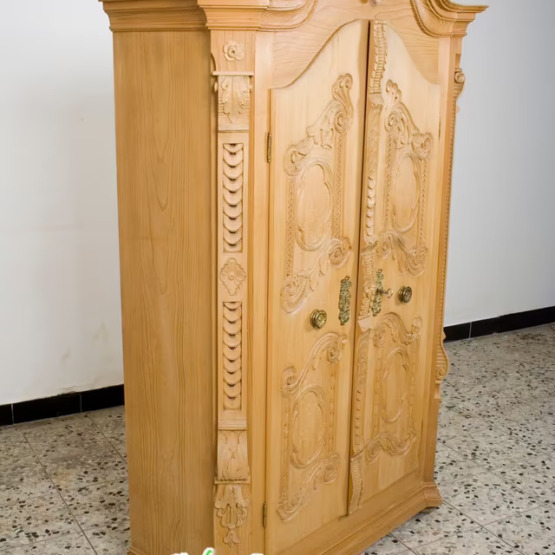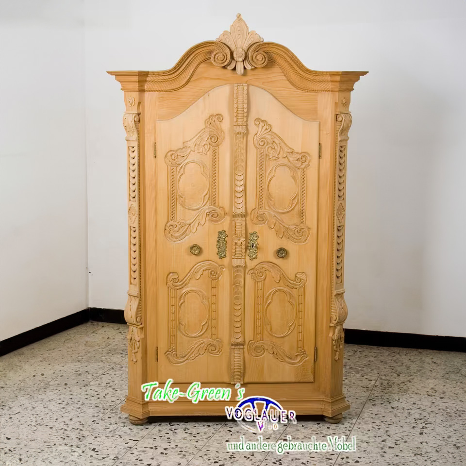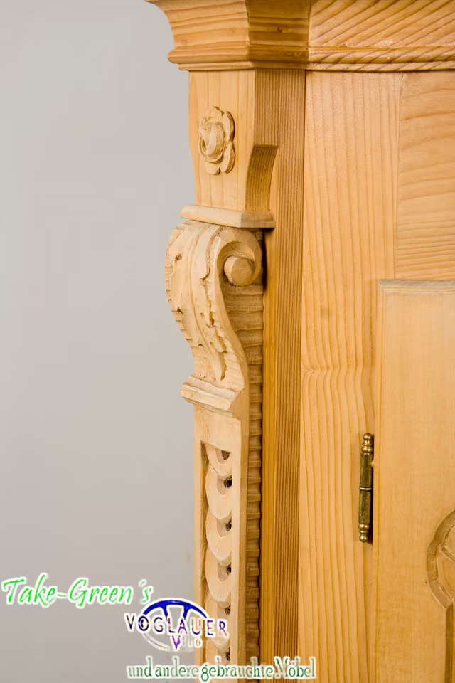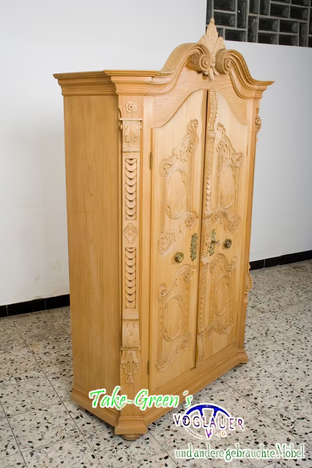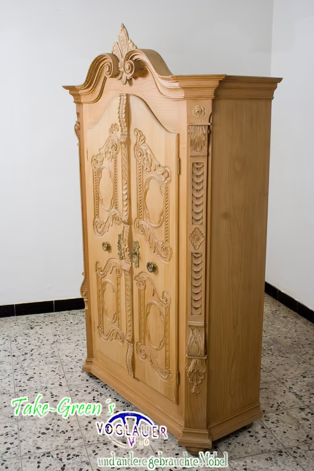 Aus massivem Naturholz gefertigt, zeigt er meisterliches Handwerk in jeder Linie – von den gedrehten Säulen bis zu den floral-barocken Ornamenten auf den Türen. Die aufwendige Krone verleiht dem Schrank einen fast sakralen Charakter und macht ihn zum Mittelpunkt jeder Stube, Diele oder Sammlung.