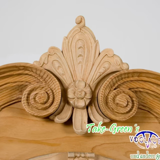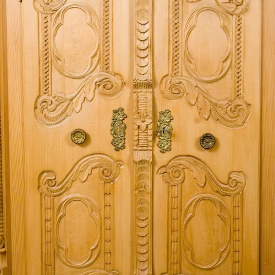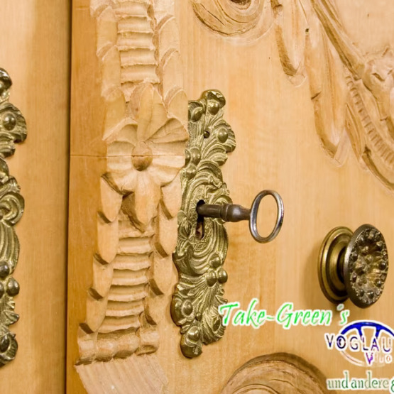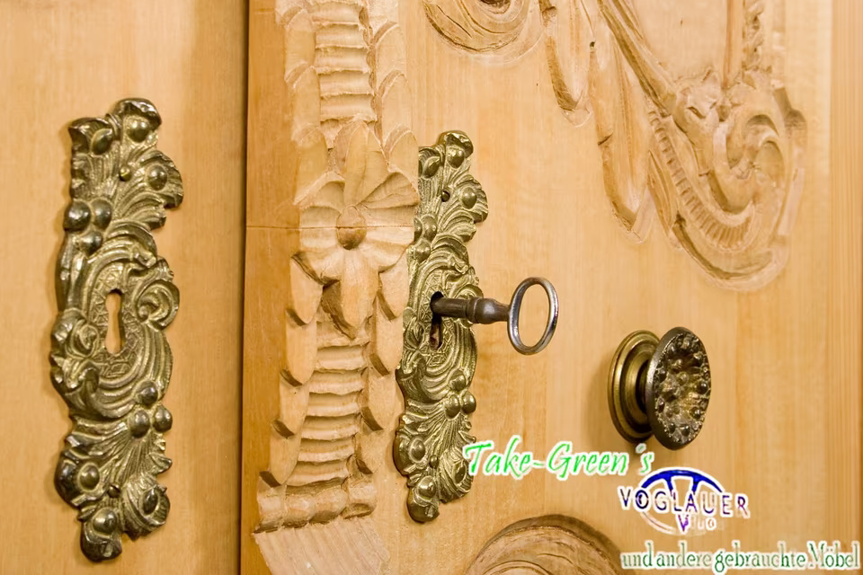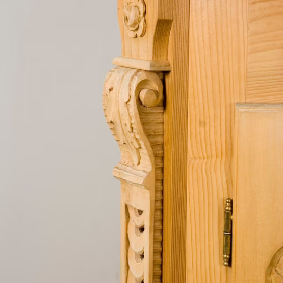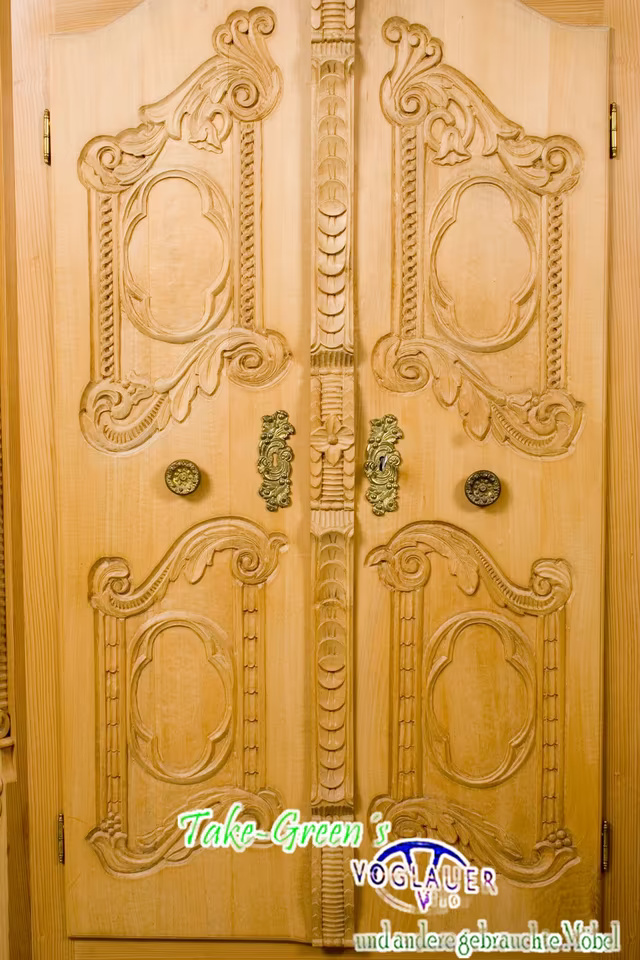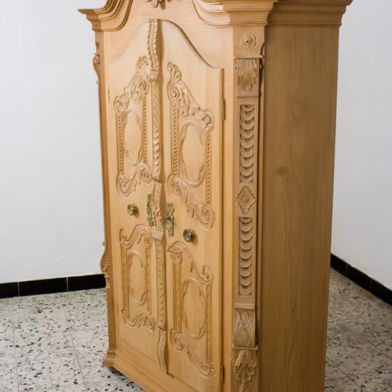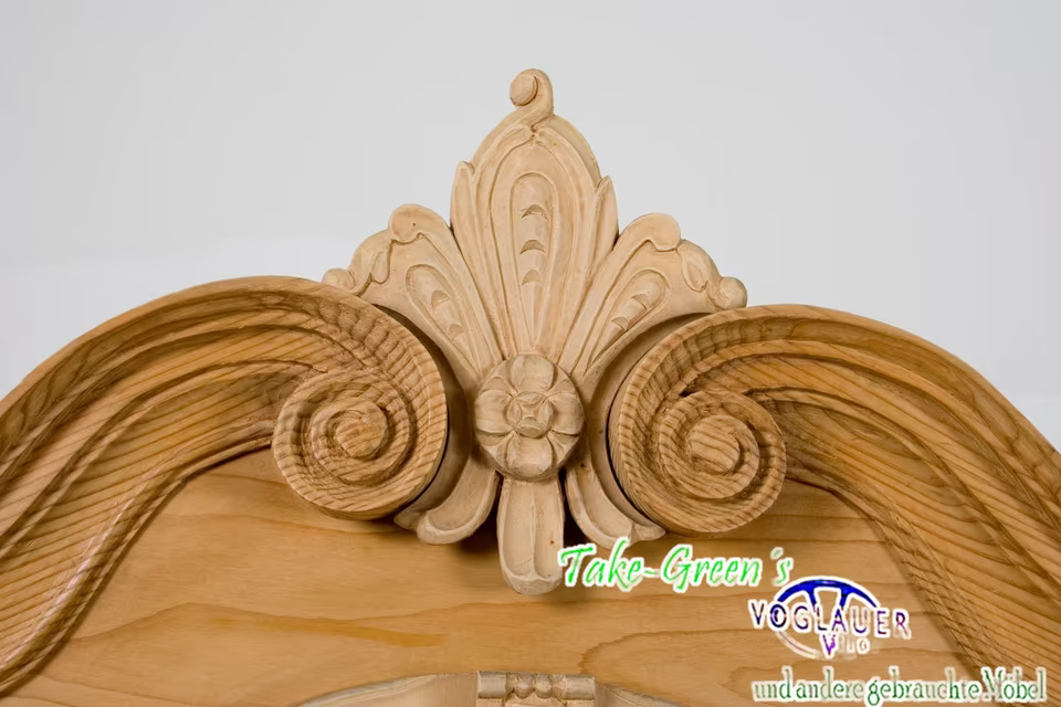 Aus massivem Naturholz gefertigt, zeigt er meisterliches Handwerk in jeder Linie – von den gedrehten Säulen bis zu den floral-barocken Ornamenten auf den Türen. Die aufwendige Krone verleiht dem Schrank einen fast sakralen Charakter und macht ihn zum Mittelpunkt jeder Stube, Diele oder Sammlung.