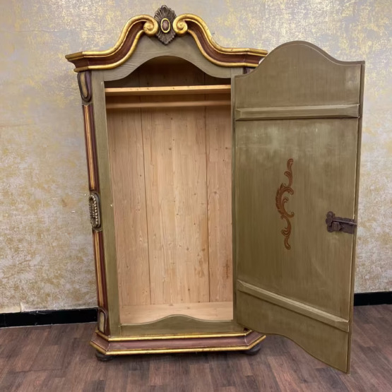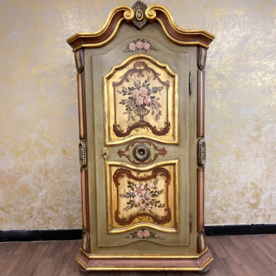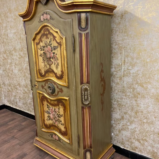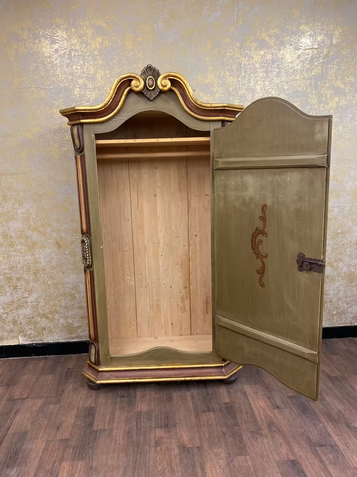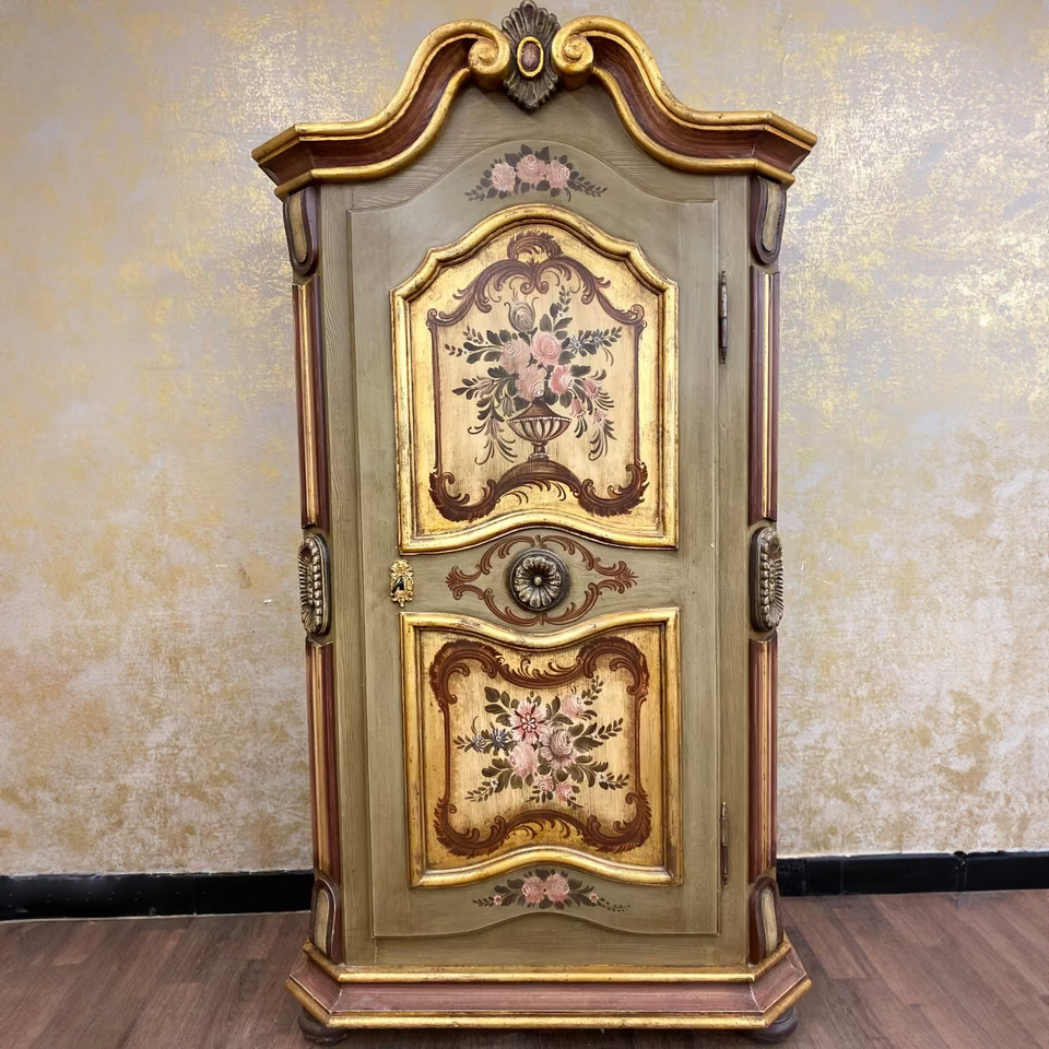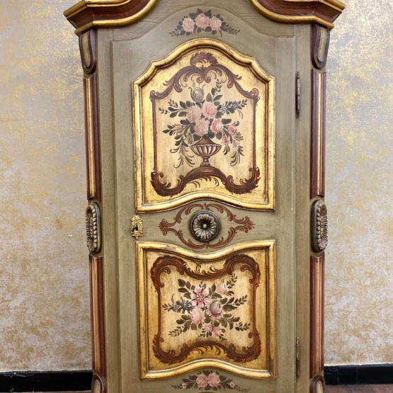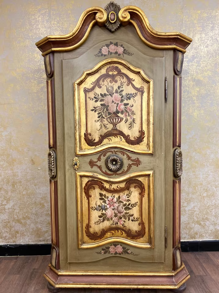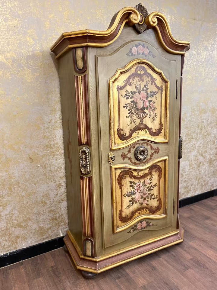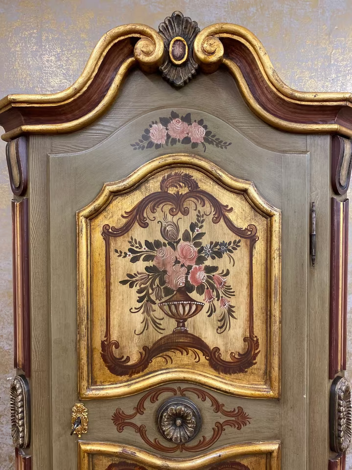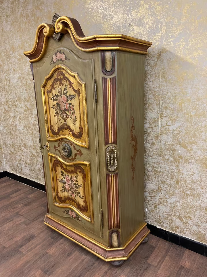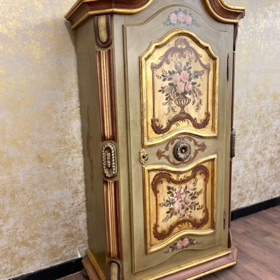 Die geschwungene Krone mit Goldakzenten verleiht dem Möbel eine festliche Ausstrahlung, während florale Motive auf goldgerahmten Feldern den ländlich-romantischen Charakter unterstreichen. Die bemalte Innenseite der Tür sowie die gedrechselten Seitenelemente runden das Gesamtbild ab.