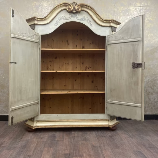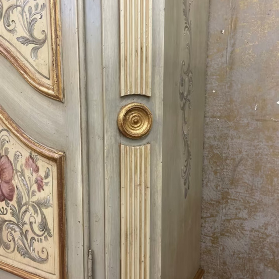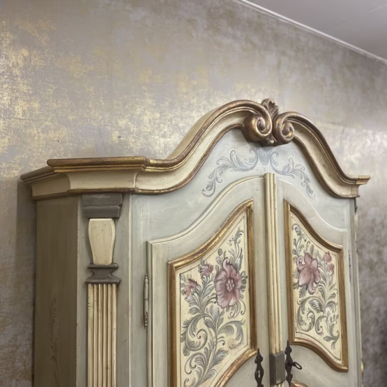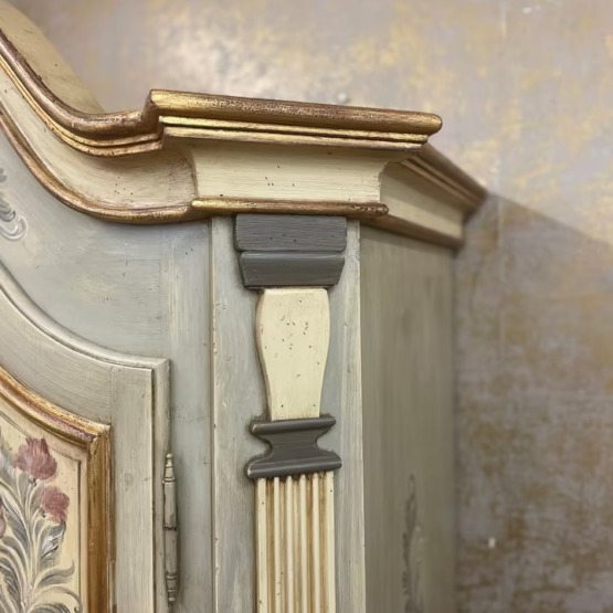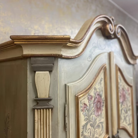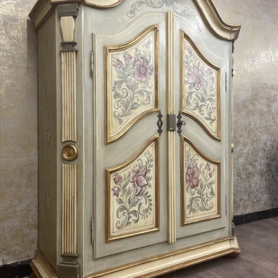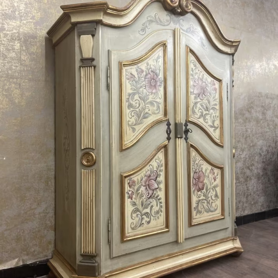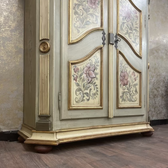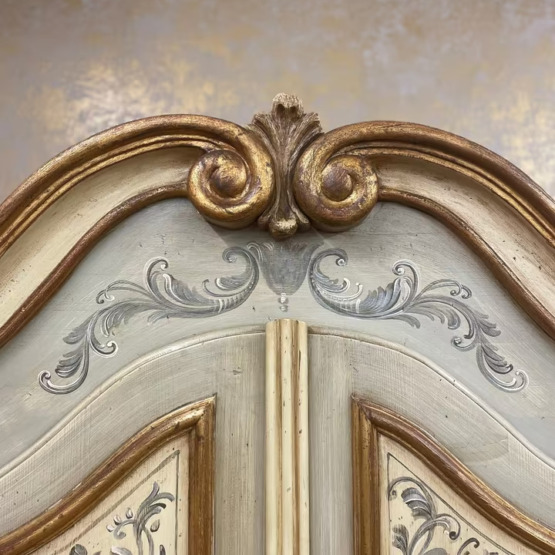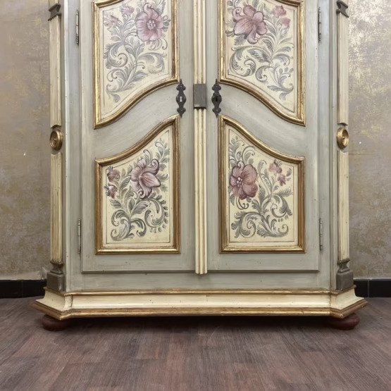 Die sanft geschwungenen Türen, eingerahmt von vergoldeten Zierleisten, präsentieren florale Malereien, die an italienische Palazzi erinnern – kunstvoll, lebendig und mit viel Liebe zum Detail. Die cremefarbene Patina unterstreicht die zeitlose Anmut, ohne aufdringlich zu wirken.