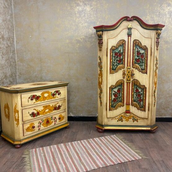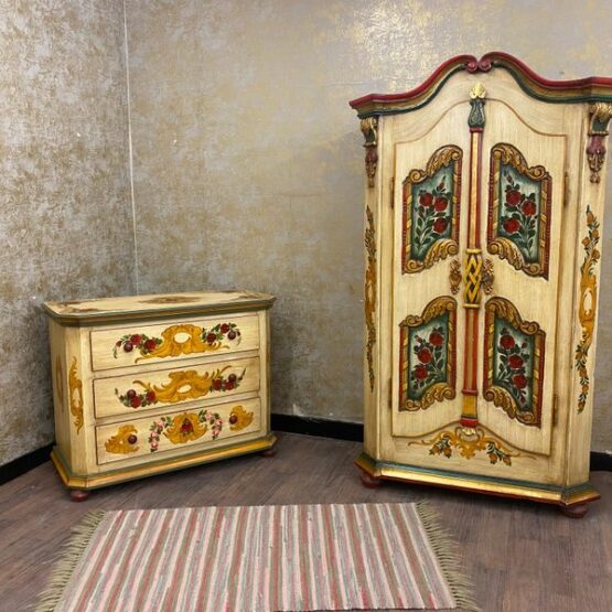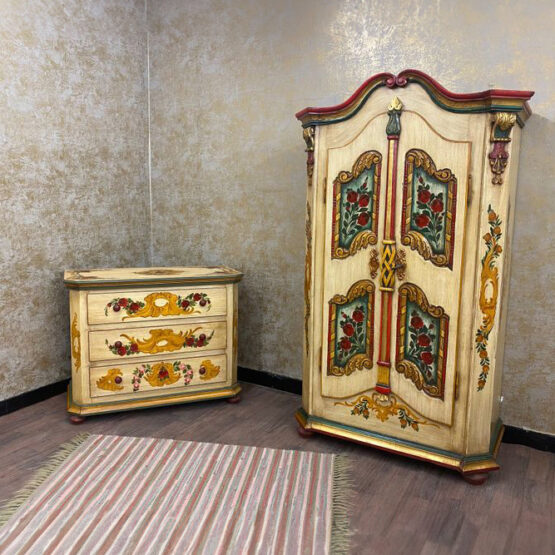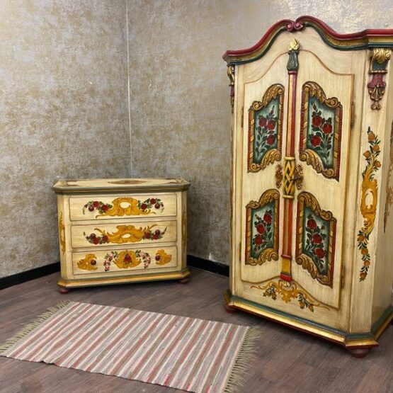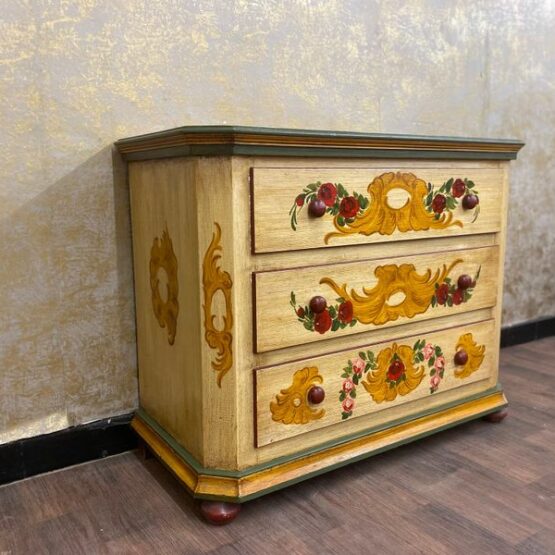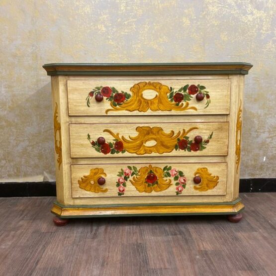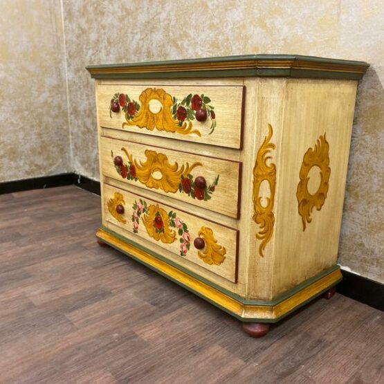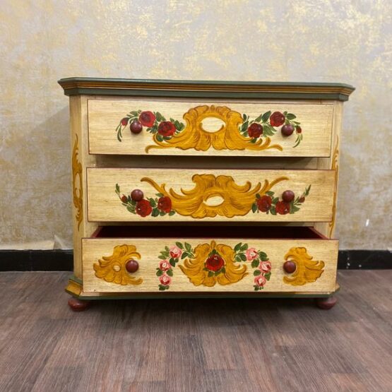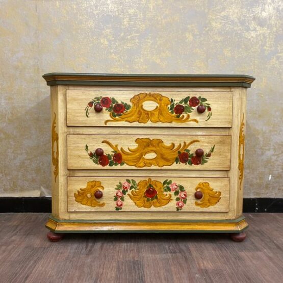 Ihre cremefarbene Fassung wird durch florale Malereien in warmen Rottönen und goldgelben Ornamenten veredelt – jedes Detail ist von Hand gestaltet. Drei geräumige Schubladen bieten reichlich Platz für Kleidung, Wäsche oder Alltagsgegenstände.