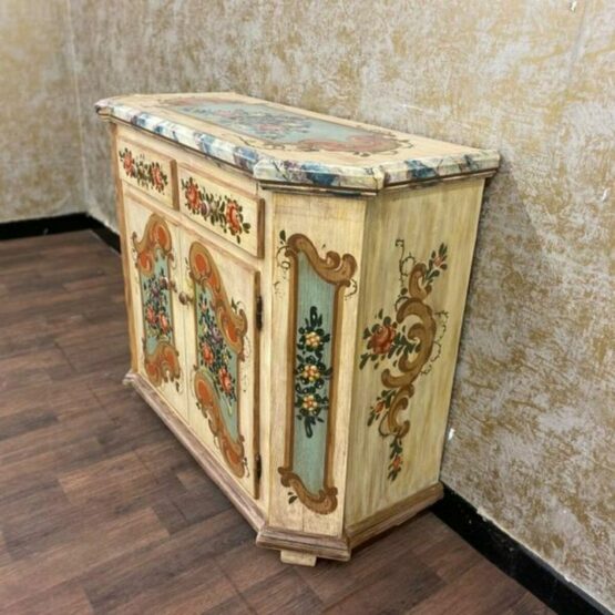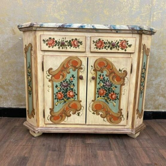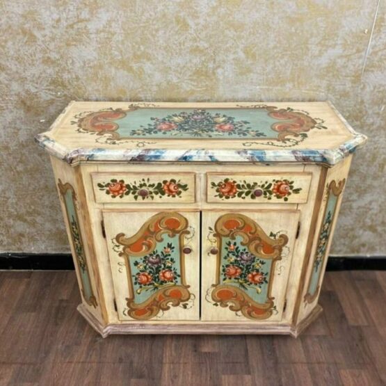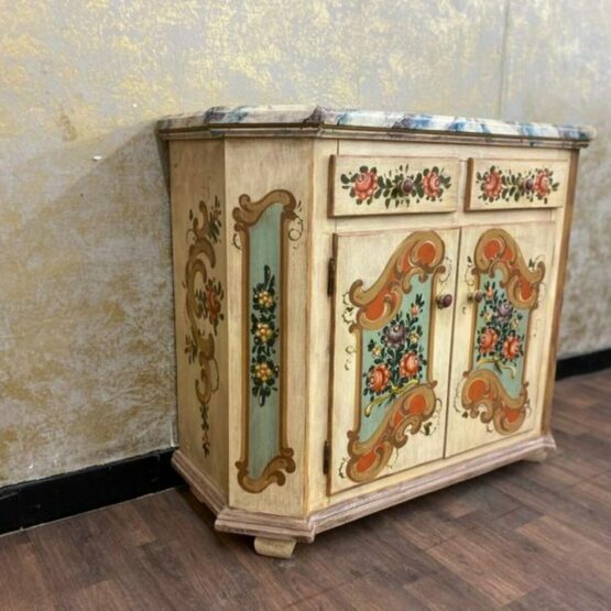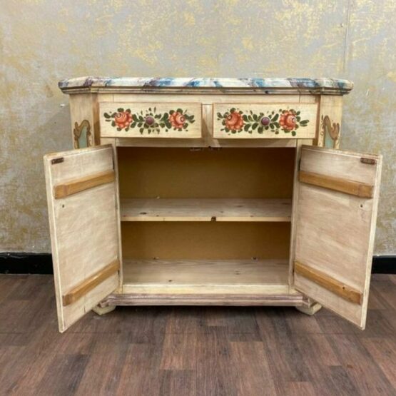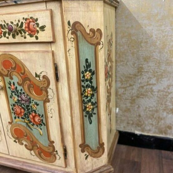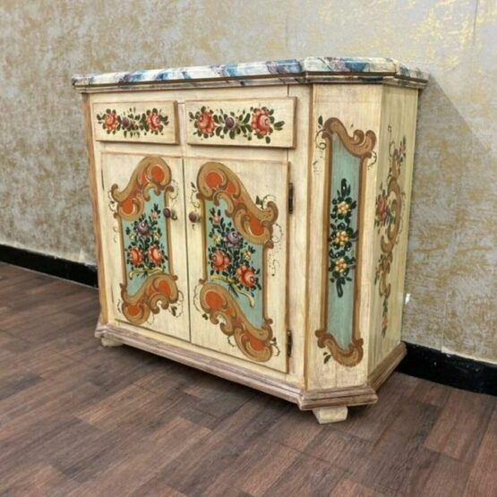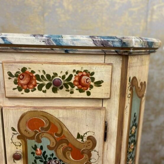 Ein Kommode mit wunderschönen Verzierungen und weißer, floraler Bemalung im Bauernstil. Ein einzigartiges Schränkchen mit vielen Details zum Entdecken.