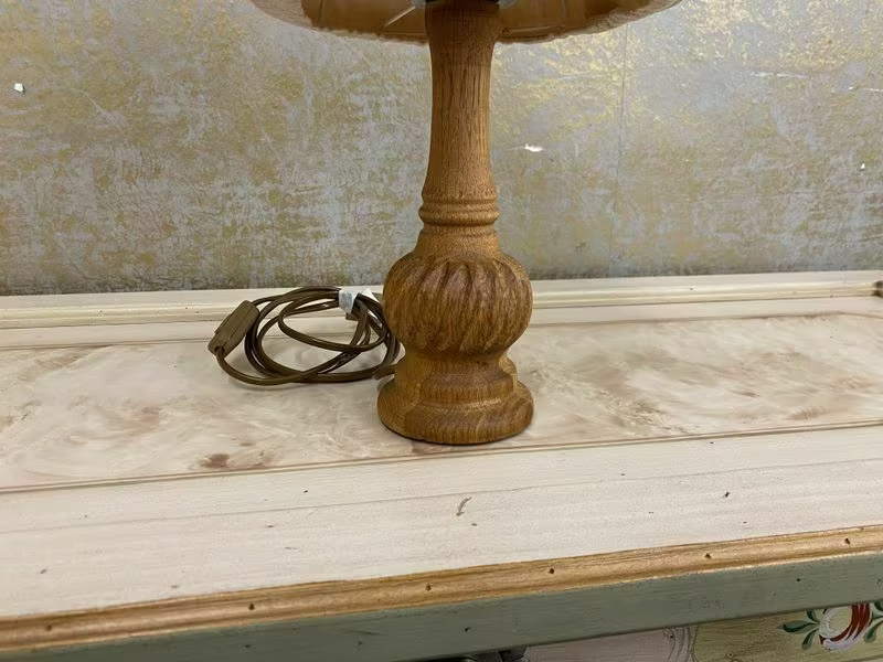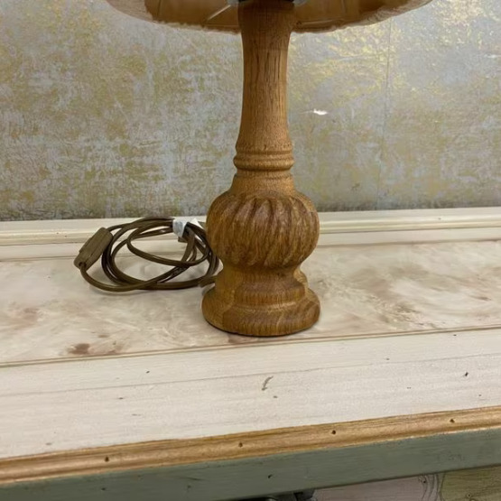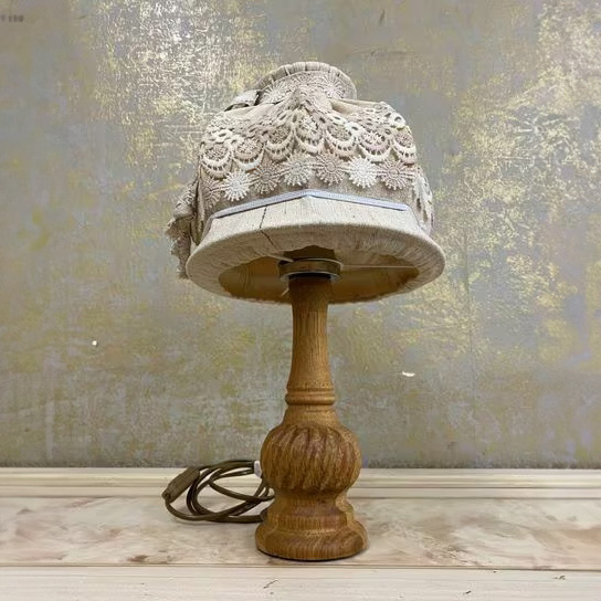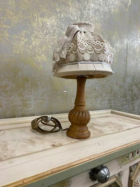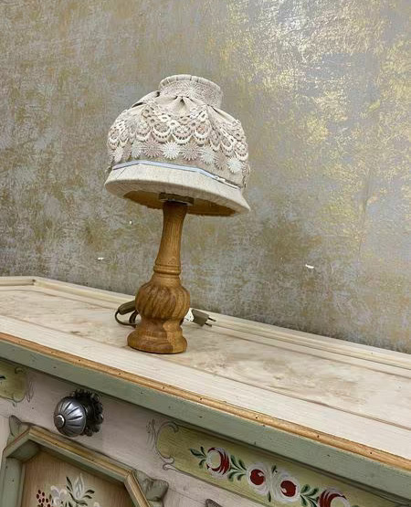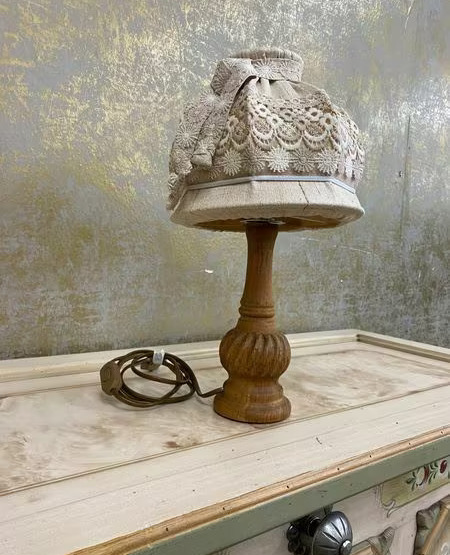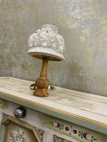 Das helle Holz trägt Spuren ehrlicher Handarbeit, jedes Detail wirkt wie geschnitzt mit Herz und Geduld. Der Schirm aus cremefarbener Spitze lässt das Licht weich durchscheinen und zaubert eine stille, gemütliche Atmosphäre.