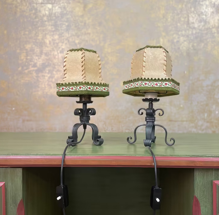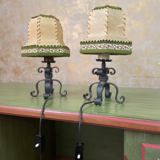 Dieses antike Lampen-Set bringt genau diese Stimmung ins Heute. Die Arme aus geschwärztem Eisen sind kunstvoll geschwungen, jede Linie ein kleines Stück Handwerkskunst. Die schlichten, trichterförmigen Schirme verleihen dem Licht eine sanfte Note und sorgen für eine behagliche Atmosphäre.