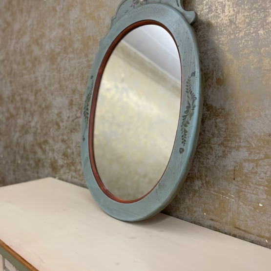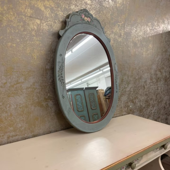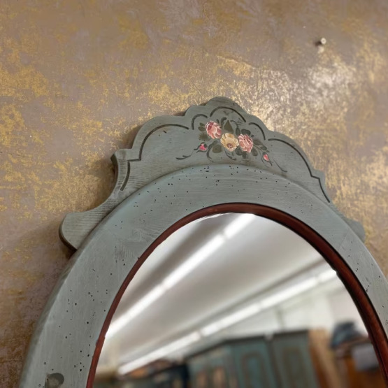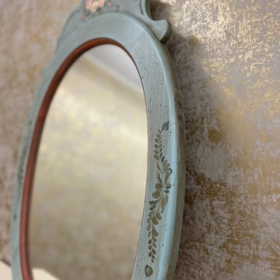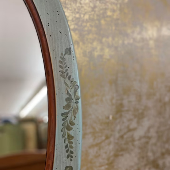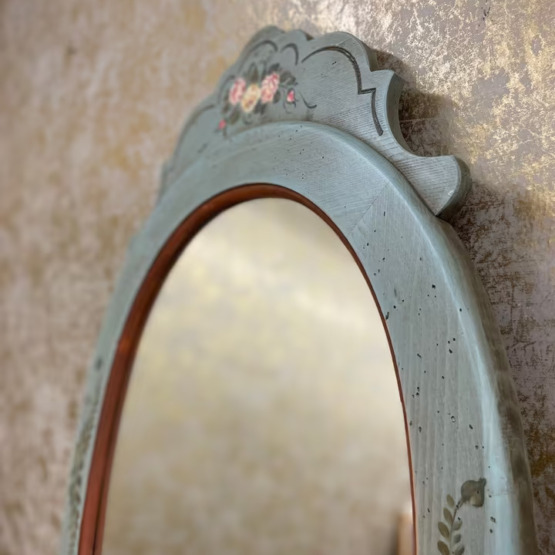 Ein Hauch von Poesie für Ihre Wand: Dieser ovale Spiegel verleiht jedem Raum eine sanfte, fast märchenhafte Note. Sein altgrün gefasster Holzrahmen mit zarter Blumenmalerei wirkt wie aus einer anderen Zeit – fein, charmant und doch zurückhaltend.