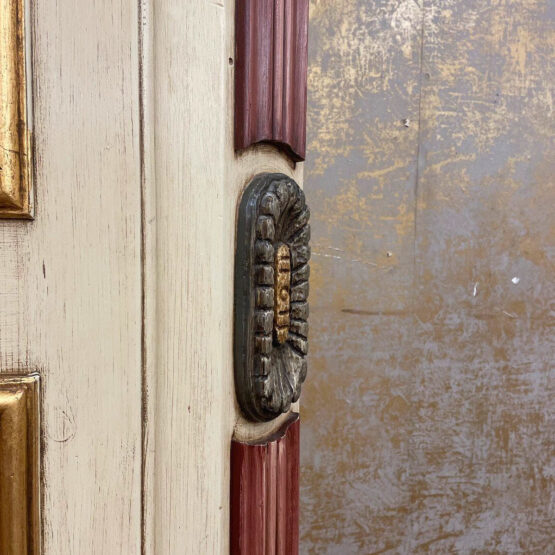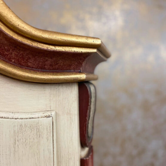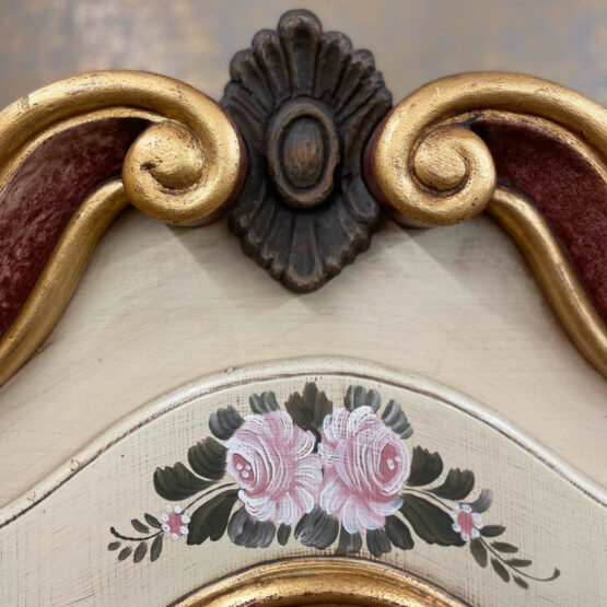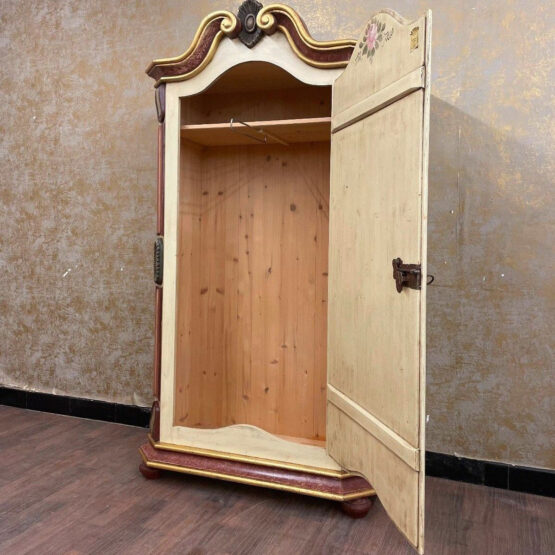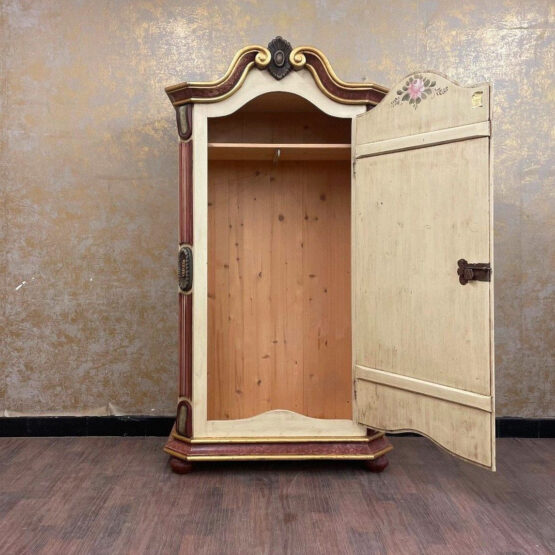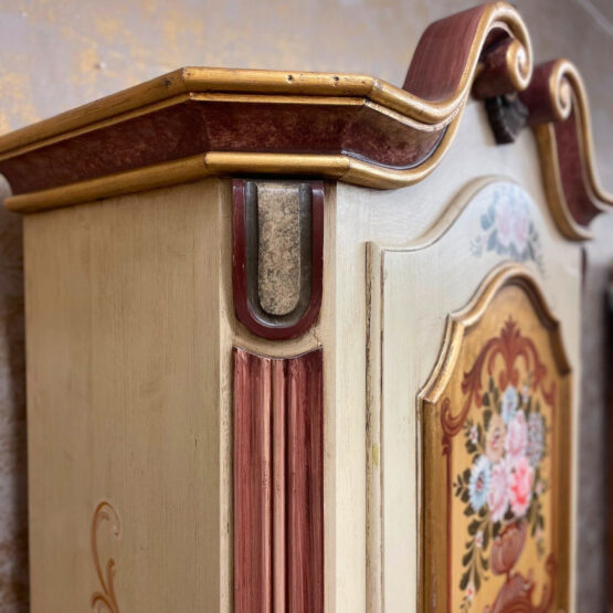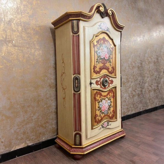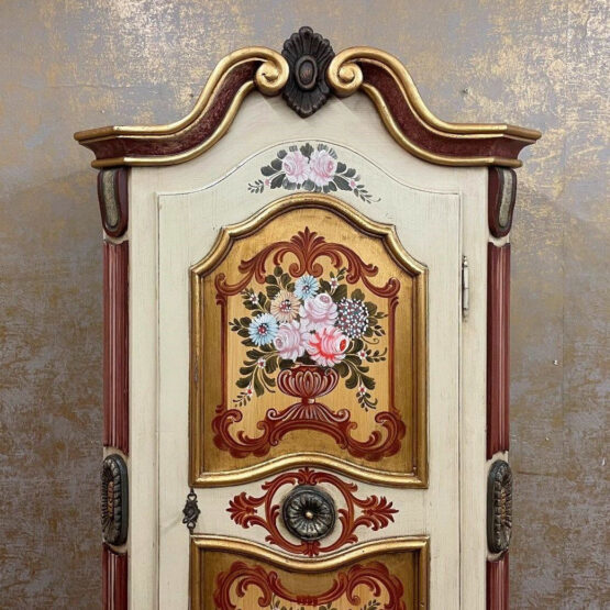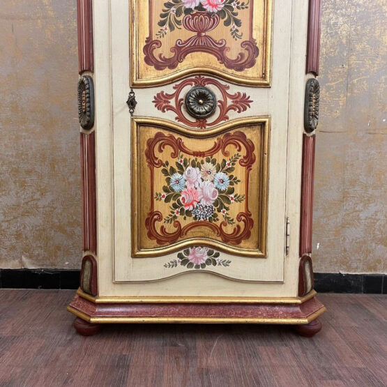 Durch die floralen Muster und die goldenen Verzierungen wirkt er beinahe königlich. Die aufwendig gestaltete Tür, verziert mit zwei kunstvollen Blumenbouquets, ist ein Highlight für jedes Auge. Ob im Flur, im Schlaf- oder Wohnzimmer – für Vintage-Liebhaber ist dieser Schrank ein wahres Kunstwerk, das Ihrem Raum einen ganz besonderen Charme schenkt und Eleganz verleiht.
