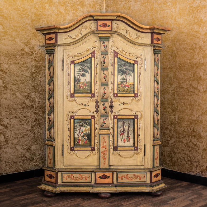 Ein Blick genügt und man spürt die Ruhe vergangener Tage. Dieser originale Voglauer Schrank aus der Rahmer-Serie vereint kunstvolle Malerei mit traditioneller Möbelbaukunst.