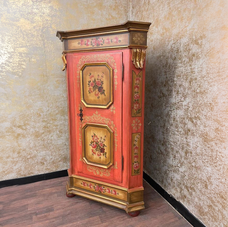 Die warme, rot-goldene Farbgebung lässt ihn sofort ins Auge fallen – florale Blütenmotive, von Hand aufgetragen, erzählen vom liebevollen Blick fürs Detail. Die beiden erhabenen Kassetten auf der Tür sind in Gold gehalten und sorgen für eine harmonische Tiefe.
