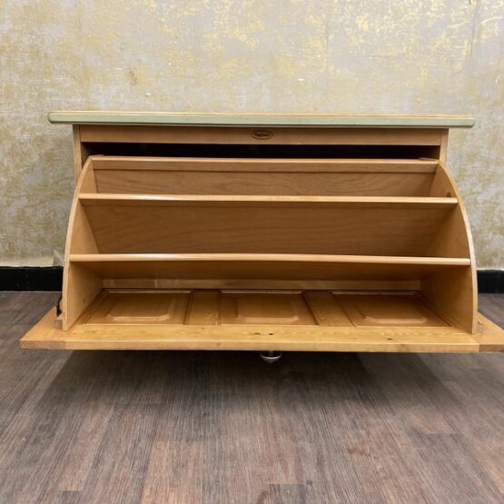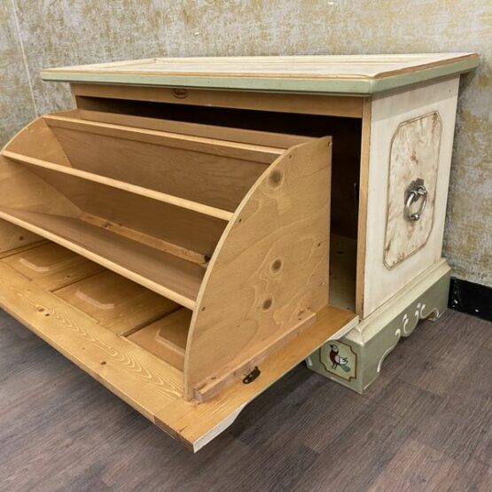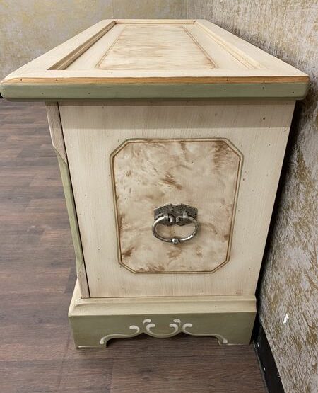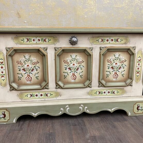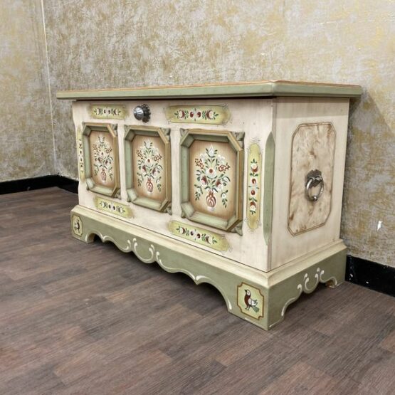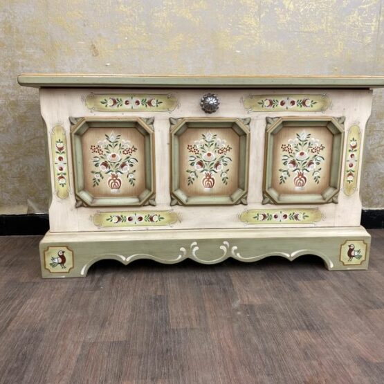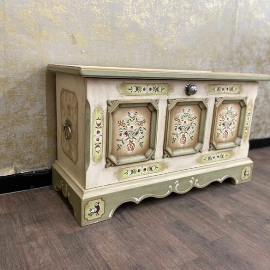 Diese Truhe verbindet praktische Aufbewahrung mit dem Charme traditioneller Handwerkskunst. Im Inneren sorgt eine durchdachte Einteilung dafür, dass Schuhe sauber und geordnet verstaut sind – ideal für den Eingangsbereich.