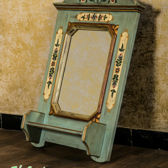 Der Rahmen aus massivem Fichtenholz ist in einem charmanten Altblau gehalten und mit liebevoller Bauernmalerei von Hand verziert, was dem Spiegel einen rustikalen und zugleich eleganten Charakter verleiht.