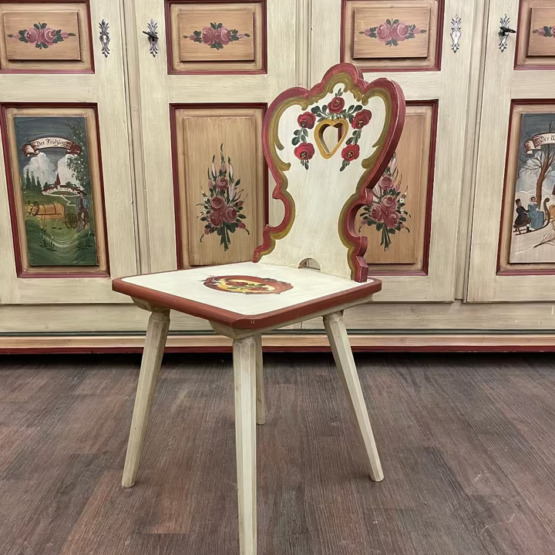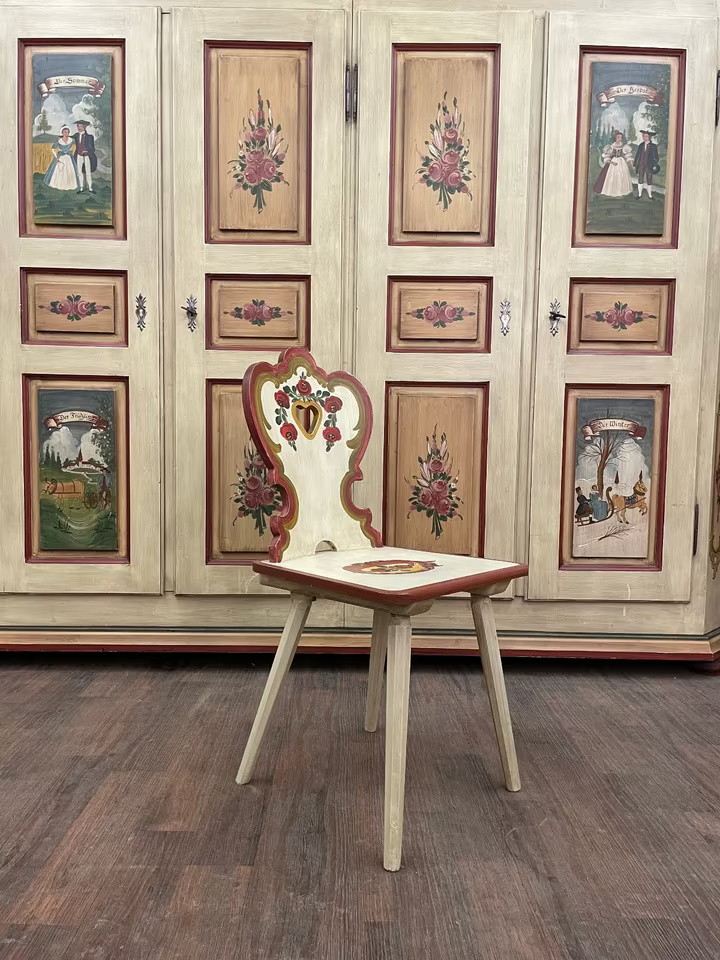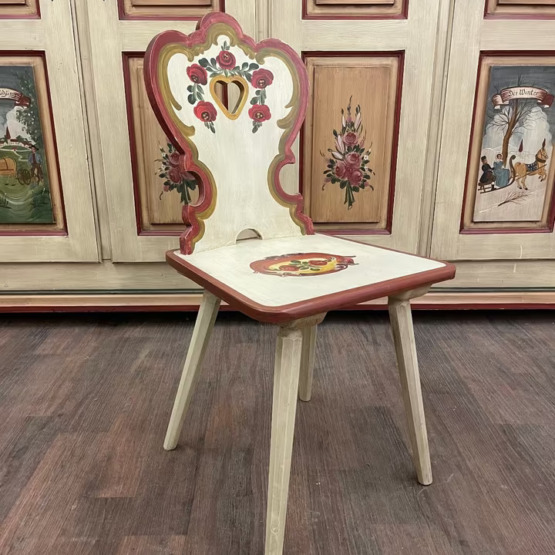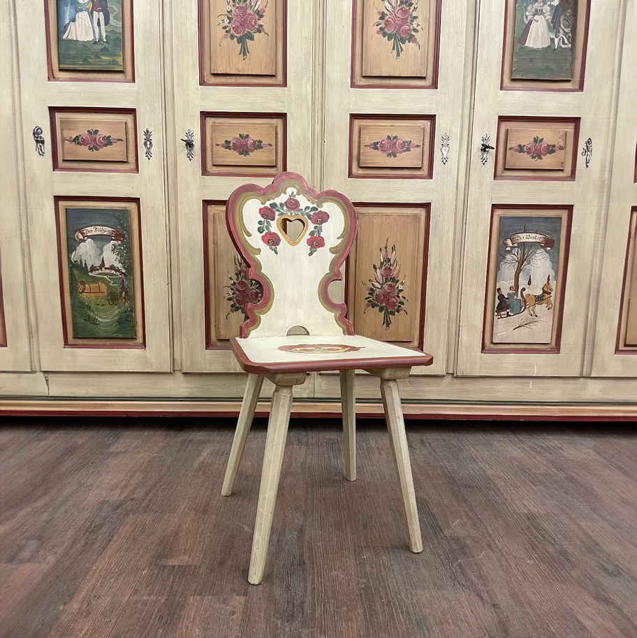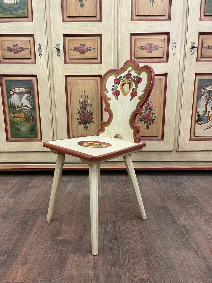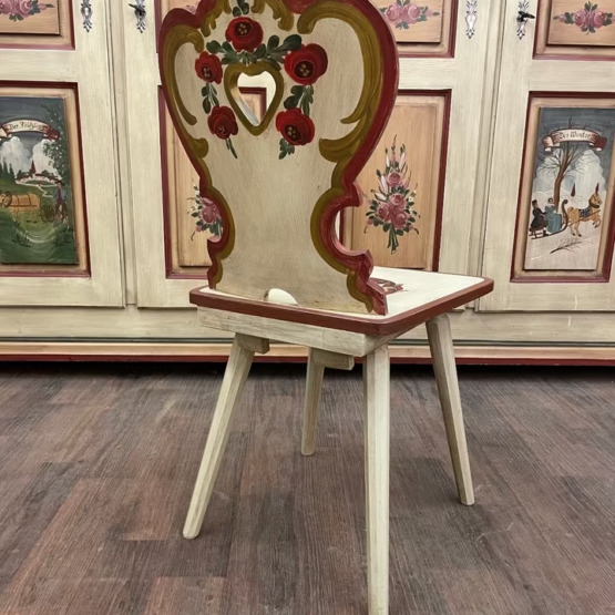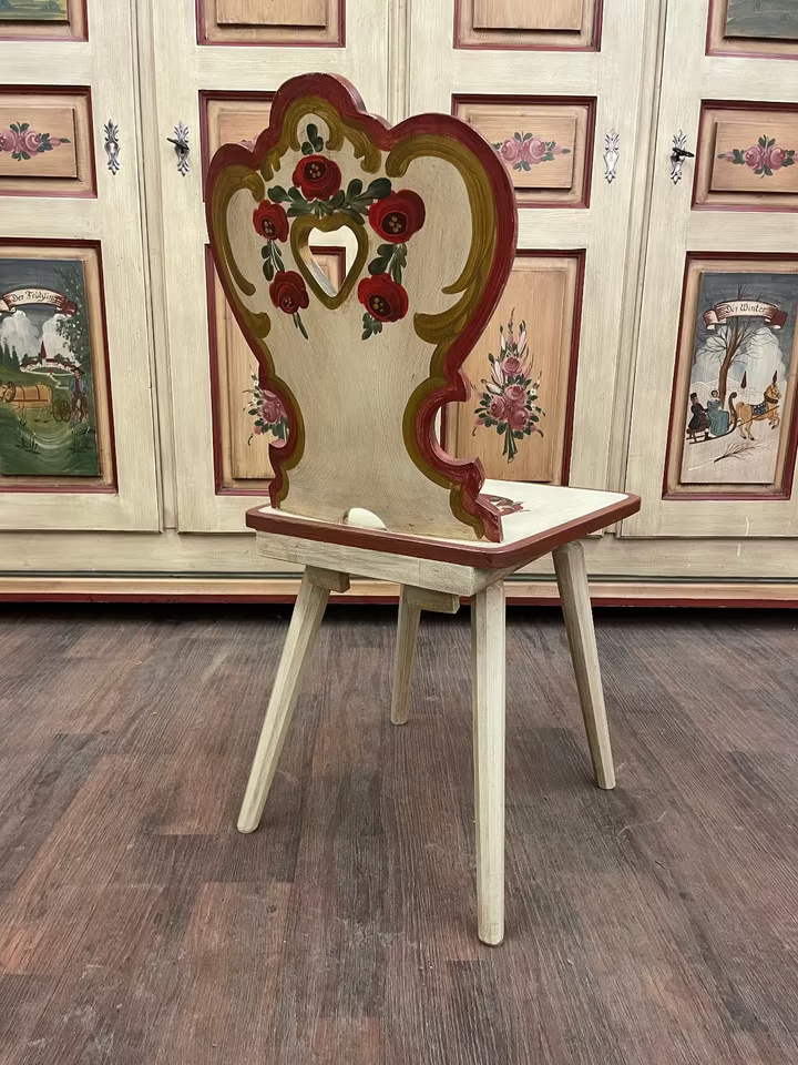 Dieser handbemalte Stuhl verkörpert alpenländische Gemütlichkeit und traditionelles Handwerk in seiner schönsten Form. Die elegant geschwungene Rückenlehne mit ausgeschnittenem Herzmotiv und floralen Malereien verleiht dem Möbelstück einen romantisch-verspielten Charakter.