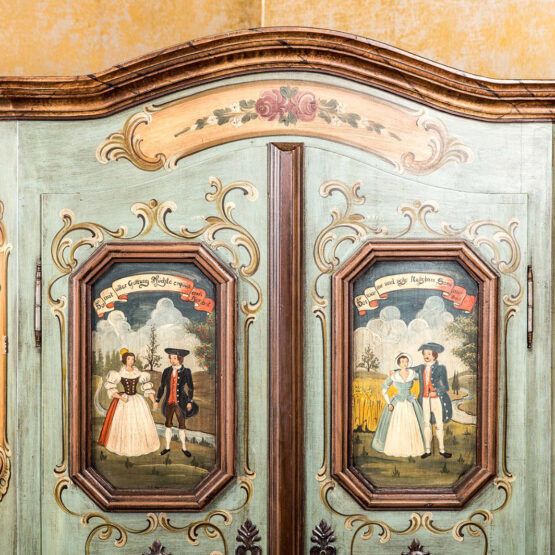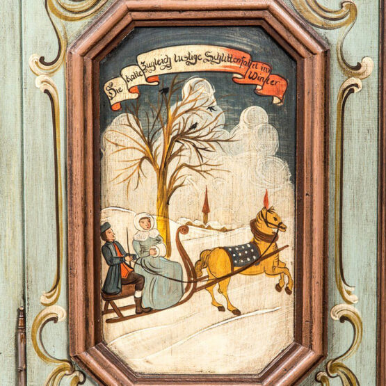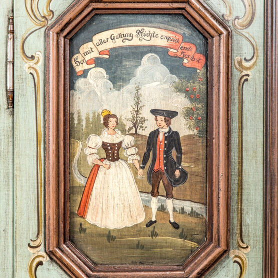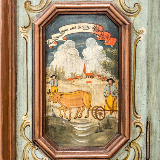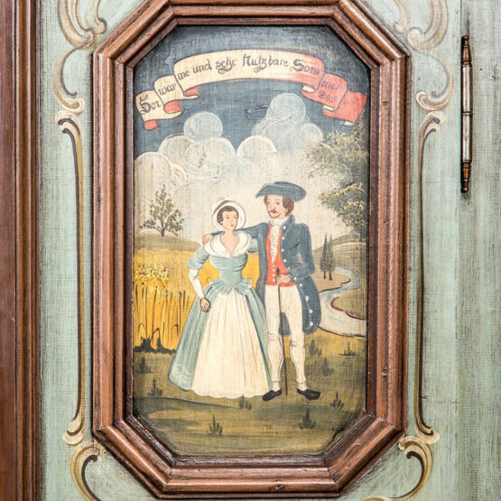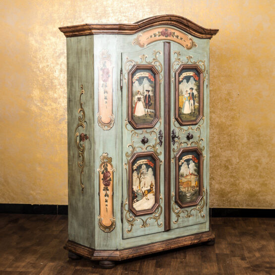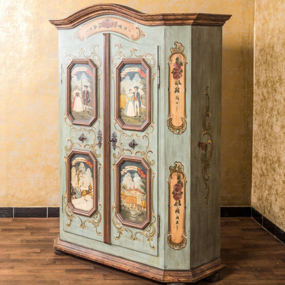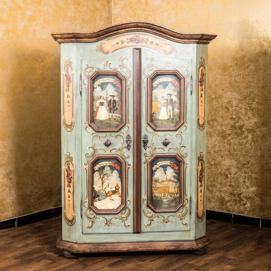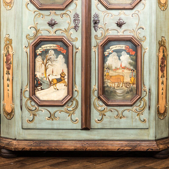 In einem sanften Altblau gehalten, fügt sich der Schrank harmonisch in verschiedene Einrichtungsstile ein und strahlt sowohl Ruhe als auch Eleganz aus. Besonders auffällig sind die beiden Türen, die mit viel Liebe zum Detail von Hand bemalt wurden. Jede der vier Türen zeigt ein einzigartiges Motiv, das eine der vier Jahreszeiten – Frühling, Sommer, Herbst und Winter – in kunstvoller Darstellung einfängt.