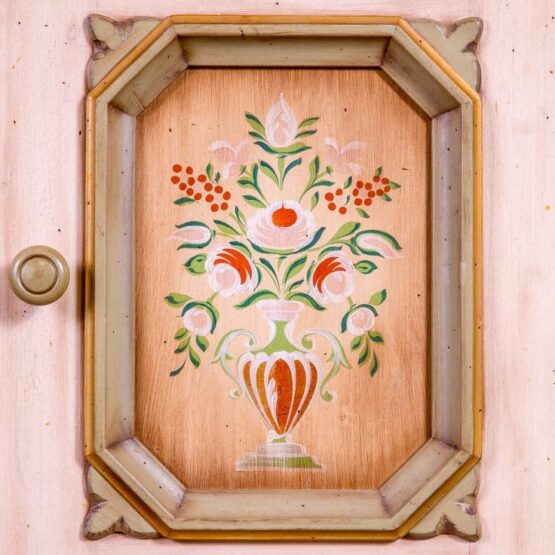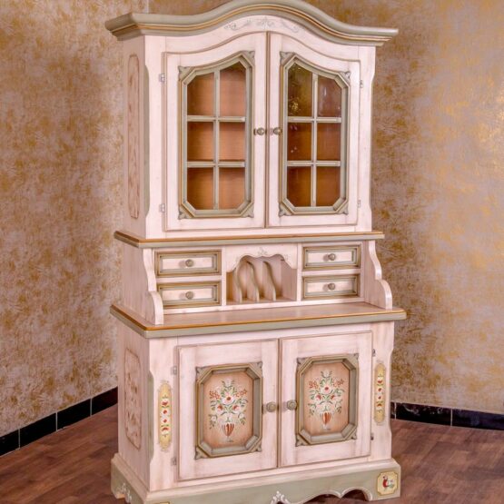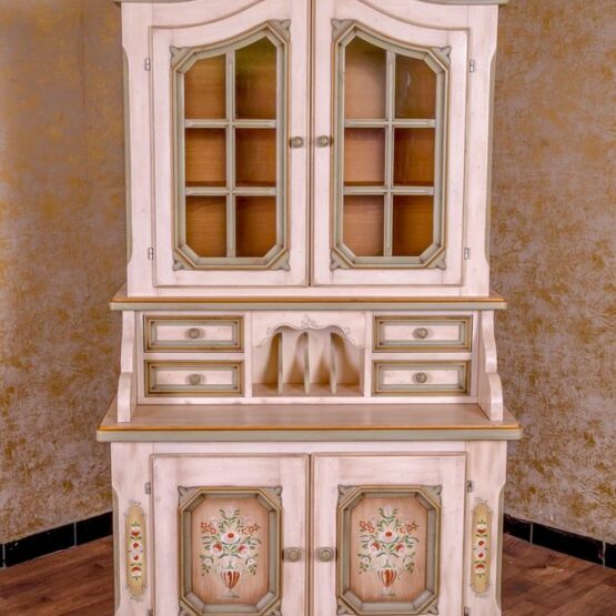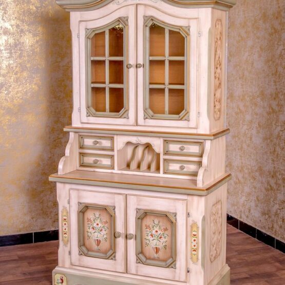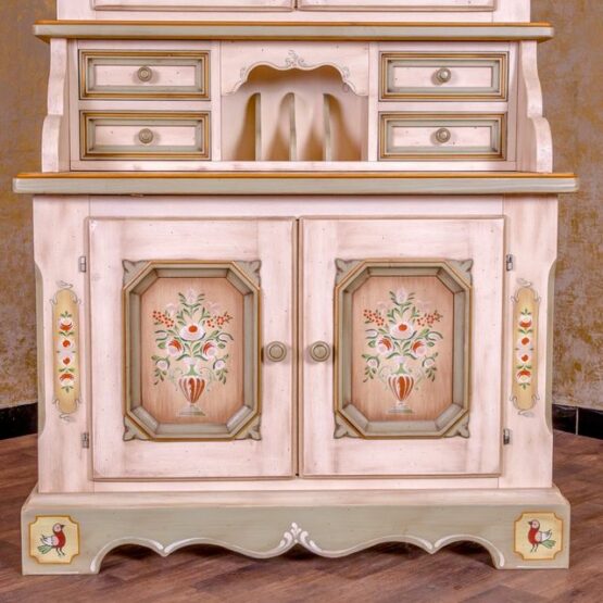 Ein Möbelstück mit Seltenheitswert: Dieser originale Voglauer Sekretär aus der Serie „Anno 1700“ vereint Vitrine, Schreibmöbel und Stauraum in einem. Der handbemalte Aufsatz mit Glastüren und floralen Verzierungen wirkt verspielt und leicht, während das massive Holz Beständigkeit und Ruhe ausstrahlt.