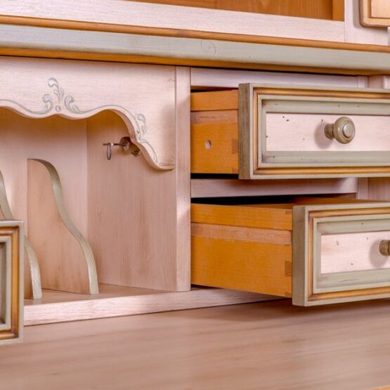 Praktische Details wie die ausziehbare Arbeitsplatte, mehrere Schubladen – darunter eine abschließbare – sowie die Türen im unteren Bereich machen den Schrank vielseitig nutzbar.