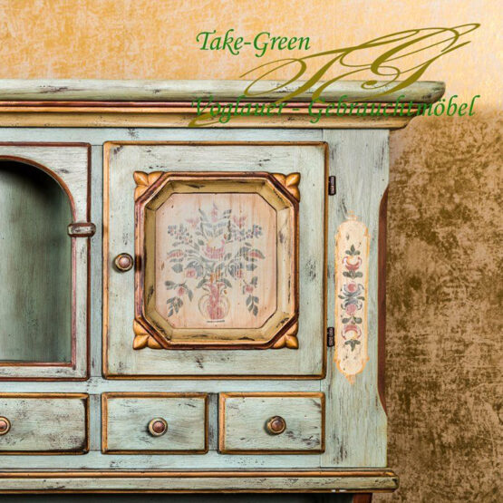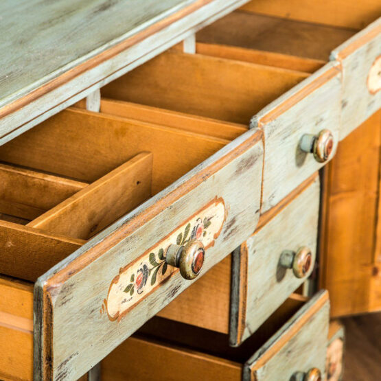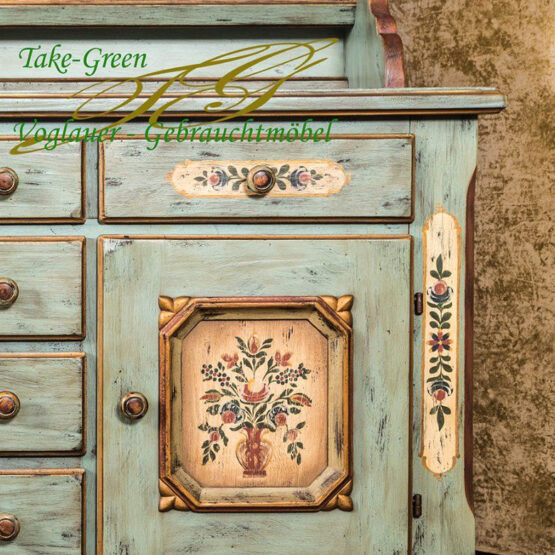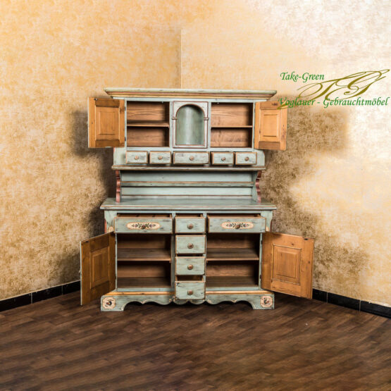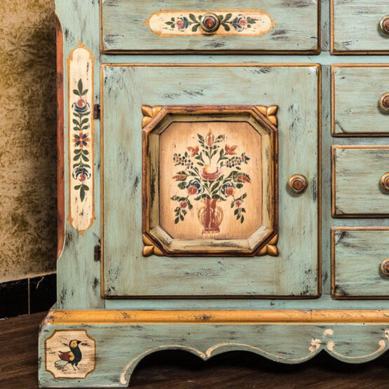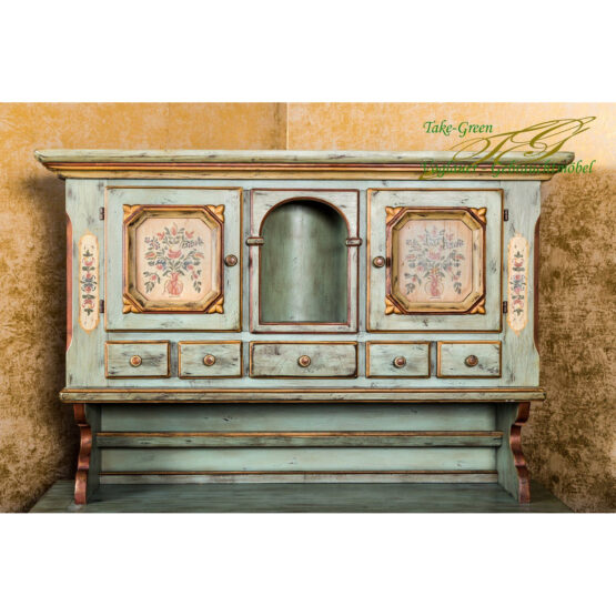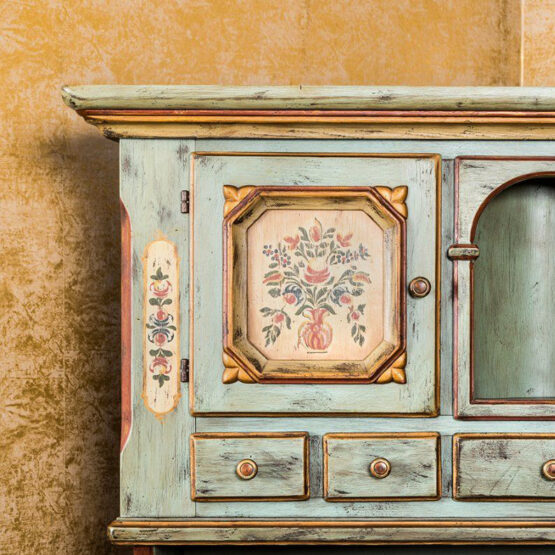 Entdecken Sie diesen absolut seltenen Buffetschrank von Alpenland Möbel in Altblau. Im unteren Teil des Schranks befinden sich zwei Türen und sechs geräumige Schubladen, während der obere Teil zwei Türen und fünf kleinere Schubladen aufweist. Jede Tür ist mit einer handbemalten Vase mit Blumen verziert. Der Hintergrund, eingefasst durch ein kunstvolles Passpartout, zeigt die ursprüngliche Holzfarbe, was dem Schrank einen charmanten Vintage-Look verleiht. Zwischen den Türen im oberen Teil befindet sich ein angedeutetes offenes Fach, welches dem Schrank zusätzliche Tiefe verleiht.