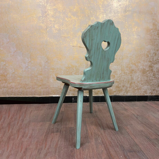 Die Rückenlehne ist mit einem herzförmigen Ausschnitt versehen, dessen Ränder, wie alle anderen Kanten des Stuhls, rot abgesetzt sind. Über diesem Ausschnitt befindet sich ein handgemaltes florales Motiv mit zwei Herzen, das dem Stuhl eine liebevolle Note verleiht.