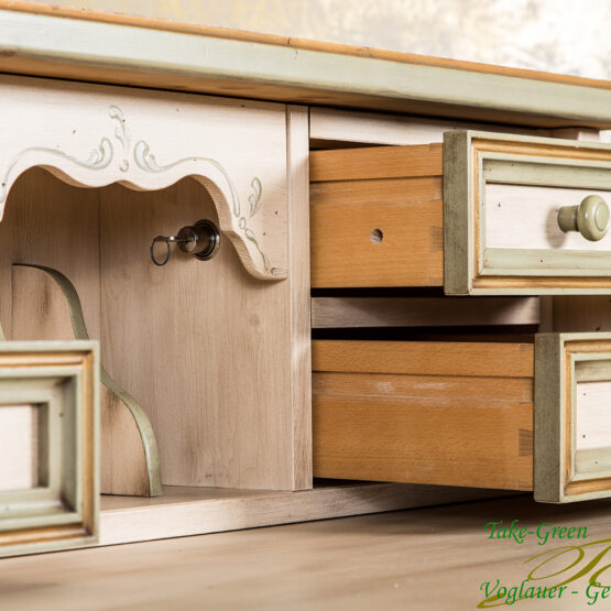 Der Sekretär verfügt über eine Vielzahl von praktischen Fächern, Schubkästen und Einlegeböden und über eine ausziehbare Schreibtischplatte.