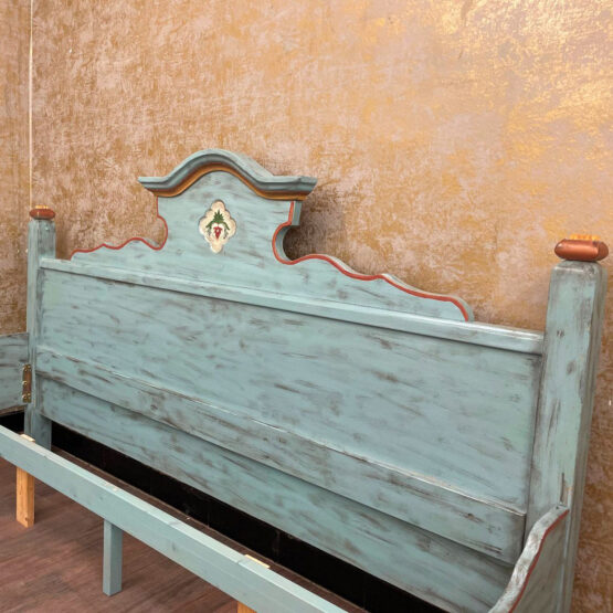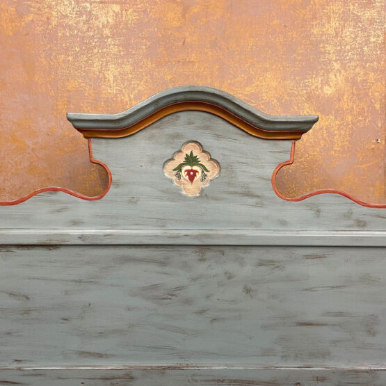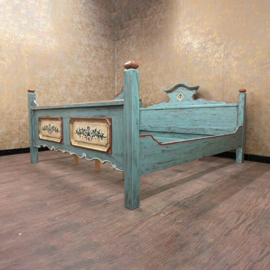 Erleben Sie das Voglauer Anno 1700 Ehebett von Alpenland Möbel, ein Meisterwerk des klassischen Designs. Am Fußende des Doppelbetts befinden sich zwei naturholzfarbene Passpartouts, die mit einem handgemalten floralen Muster verziert sind. Das Hauptelement dieses Musters findet sich mittig im Kopfteil des Bettes wieder. Die stabilen Bettpfosten sind oben mit einem Dekorelement abgerundet. Auf Wunsch sind kostenlose Lattenroste verfügbar.