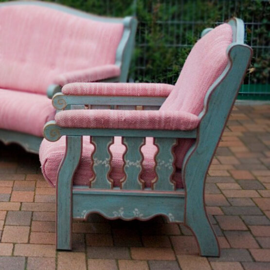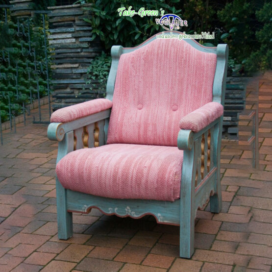 Voglauer Sessel aus der Serie Anno 1700. Die gepolsterte Sitzfläche, Rückenlehne und Armlehnen sind mit einem Stoff in zarten Rosétönen gestreift, was dem Sessel einen Hauch von Eleganz verleiht. Wie auch die seperat erhältliche Couch ist dieser Sessel in altblau handgemalt und mit feinen, floralen Elementen abgesetzt.