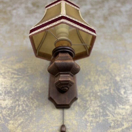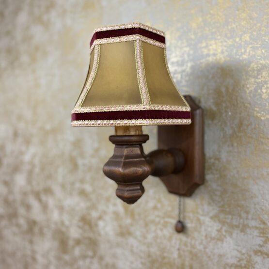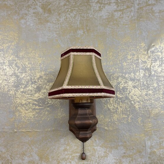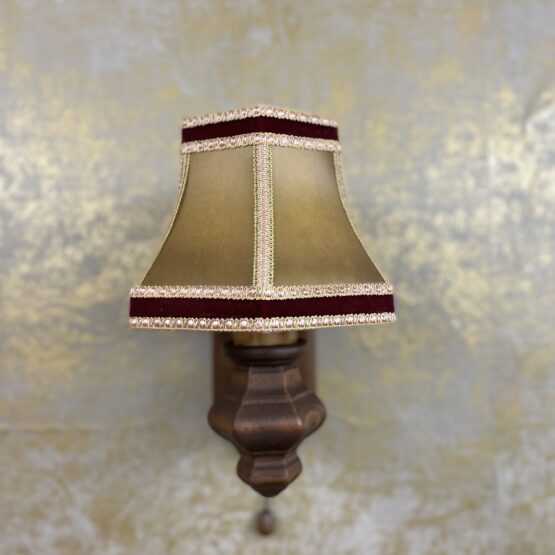 Der fein gearbeitete Holzsockel in dunkler Patina bildet den warmen Kontrast zum elegant geschwungenen Stoffschirm, der mit goldfarbenen Borten und weinrotem Samtband akzentuiert ist. Eine Lampe, die nicht einfach nur Licht spendet – sondern Atmosphäre schafft.