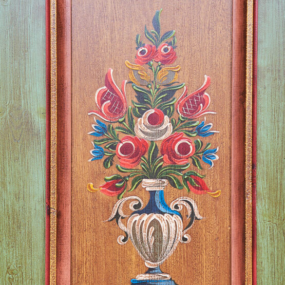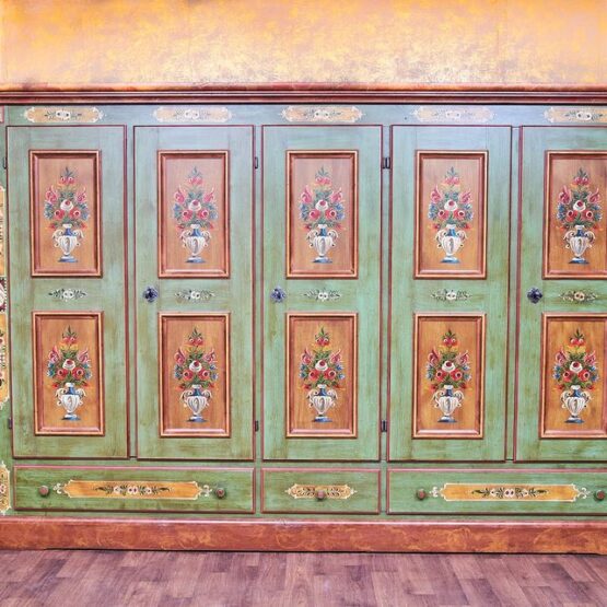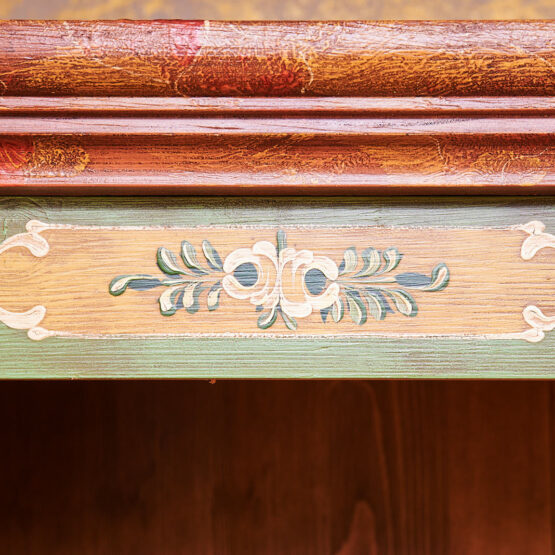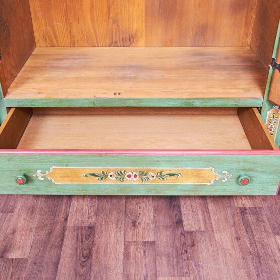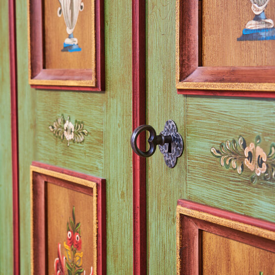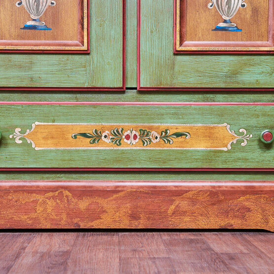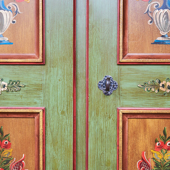 Die individuelle Gestaltung mit den vielen Verzierungen und liebevoll gestalteten Details, komplettiert das harmonische Gesamtbild. Auch die verschiedenen Farben passen ganz hervorragend zusammen, sodass sich dieser Bauernschrank wunderbar in Ihr Zuhause einfügen wird.
