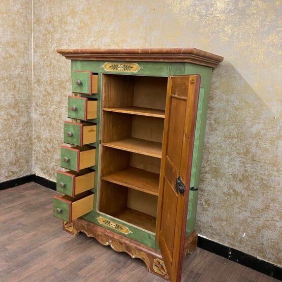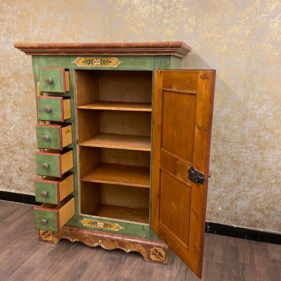 Neun kleine Schubladen auf der einen Seite bieten Platz für all die kleinen Dinge, die gut verwahrt sein wollen. Hinter der reich verzierten Tür verbirgt sich großzügiger Stauraum mit Einlegeböden aus massivem Holz. Der kunstvoll geschwungene Sockel, die warmen Farbtöne und die floralen Details verleihen dem Möbelstück eine bodenständige Eleganz.