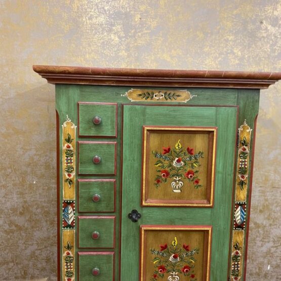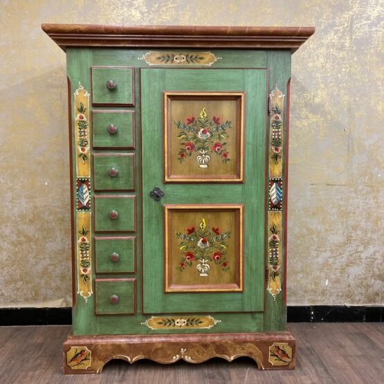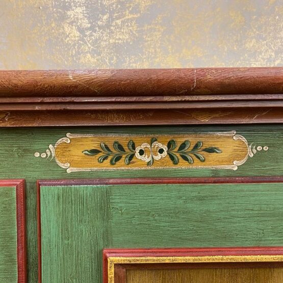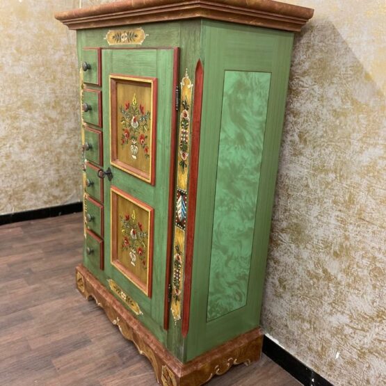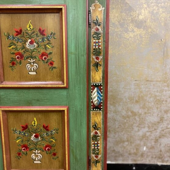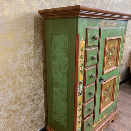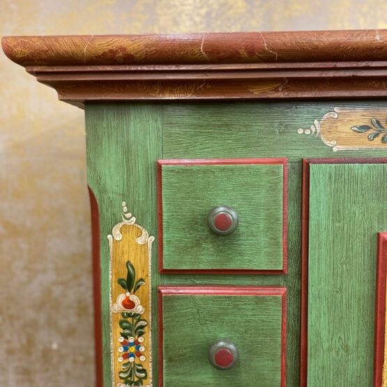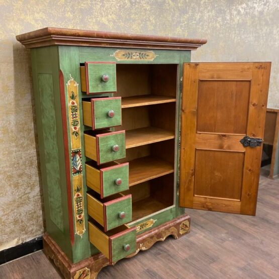 Grün wie eine frisch gemähte Almwiese, mit liebevoller Blütenmalerei verziert – dieser Voglauer Schrank bringt die Seele der Alpen in Ihre vier Wände.
