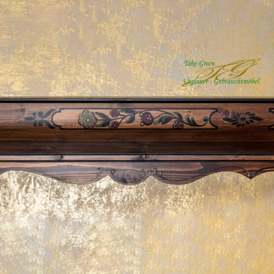 Dieses Wandregal ist mehr als nur ein Ablageort – es ist ein kunstvoller Akzent im Raum. Mit seinen feinen floralen Malereien, dem dunklen Holzton und der geschwungenen Blende verströmt es den warmen Charakter alpenländischer Handwerkskunst.
