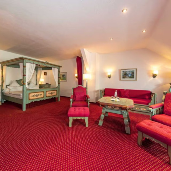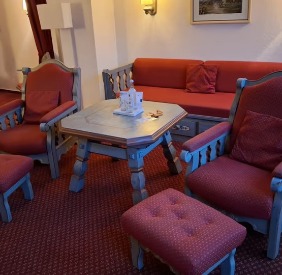 Der rot gemusterte Polsterstoff sorgt nicht nur für hohen Sitzkomfort, sondern bildet auch einen stimmungsvollen Kontrast zum Holz. So entsteht ein Möbelstück, das gleichermaßen Gemütlichkeit und alpine Eleganz ausstrahlt.