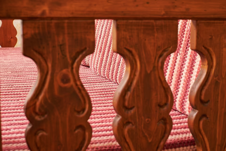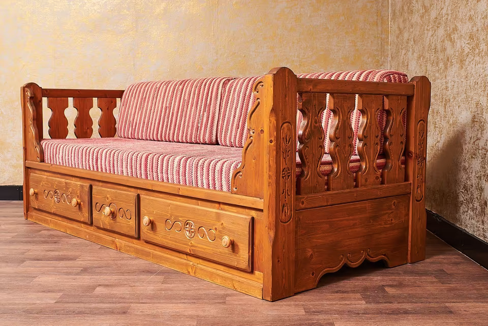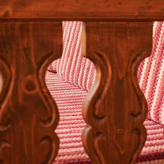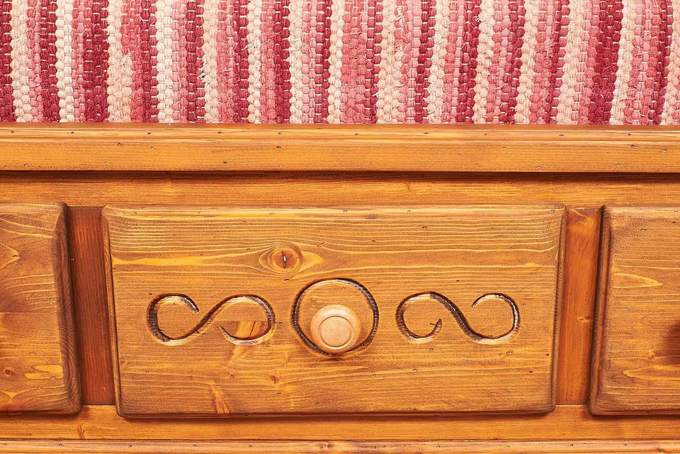 Der warme Holzton, verziert mit feinen Schnitzereien und runden Griffdetails, verleiht jedem Raum ein Gefühl von Vertrautheit und Geborgenheit. Die traditionelle Polsterung in Rot und Natur erinnert an alpine Stuben vergangener Zeiten – robust, ehrlich, einladend.