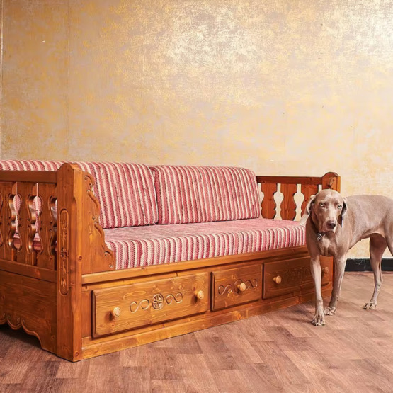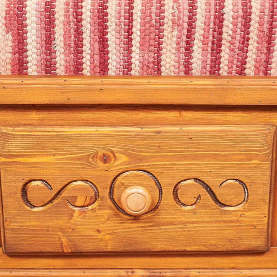 Drei geräumige Schubladen bieten zusätzlichen Stauraum für Decken, Kissen oder kleine Schätze des Alltags. Ein Möbelstück, das nicht nur sitzt, sondern bleibt – mitten im Leben.