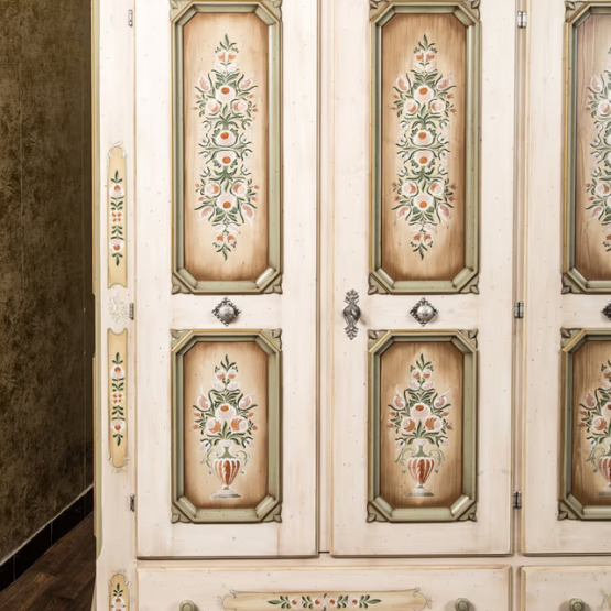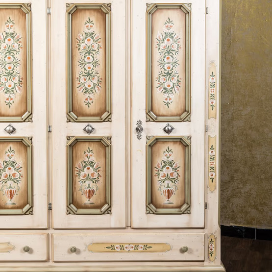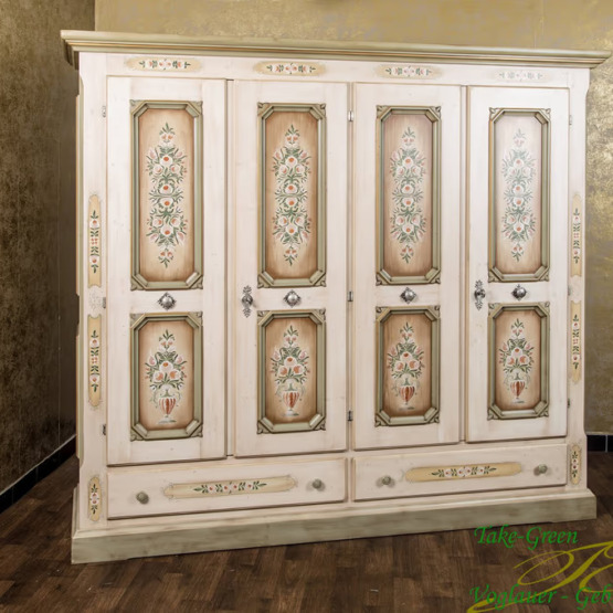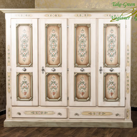 Dieser viertürige Bauernschrank im Landhausstil von “Voglauer” aus der Serie “Anno 1700” ist aus massivem Fichtenholz gefertigt und in sanftem Altweiß gehalten. Die Türen sind von Hand mit prächtigen Blumenbouquets verziert worden.