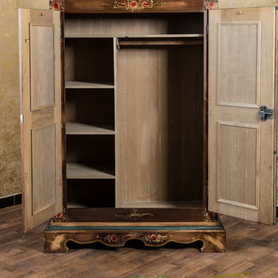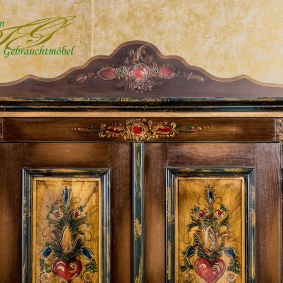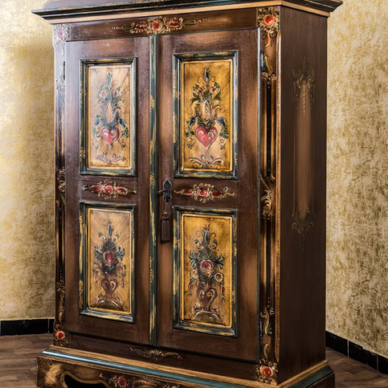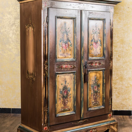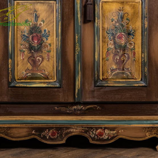 Besonderer Blickfang sind die beiden kunstvoll gestalteten Schranktüren, die mit floralen Motiven geschmückt sind – jedes Element ein kleines Kunstwerk für sich. Die warme Holzoptik und die feinen Malereien verleihen dem Schrank eine einzigartige Ausstrahlung.