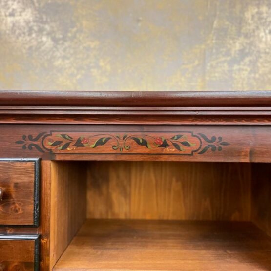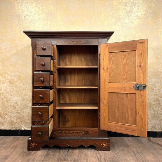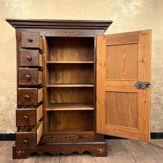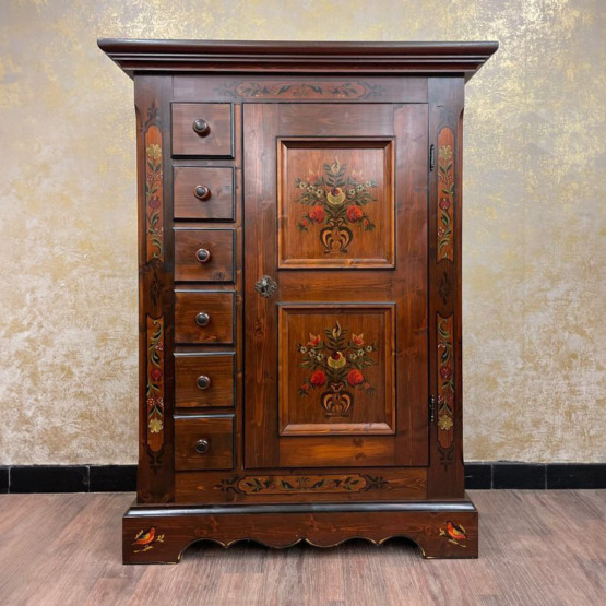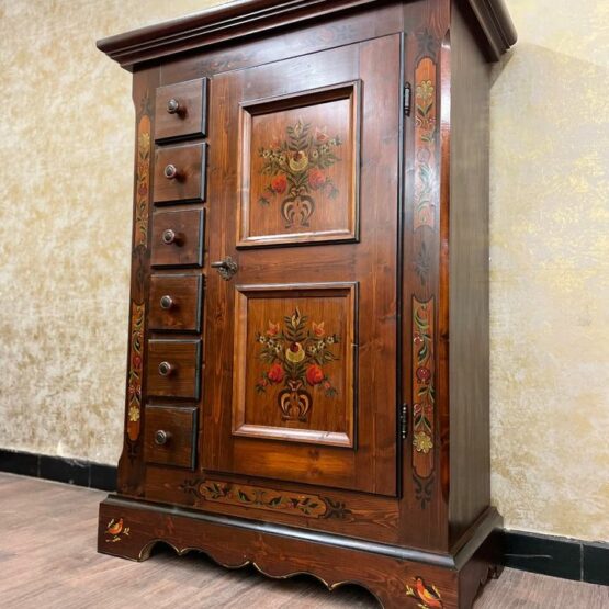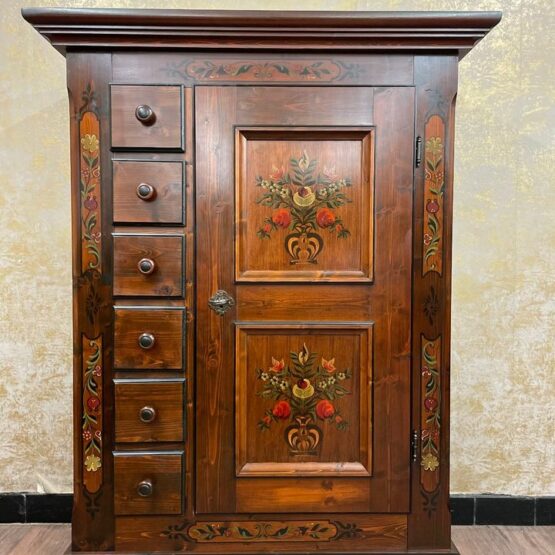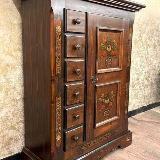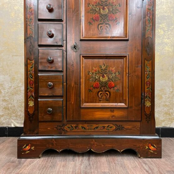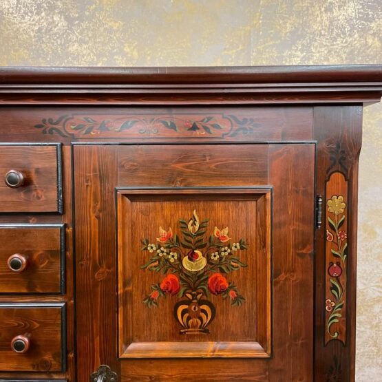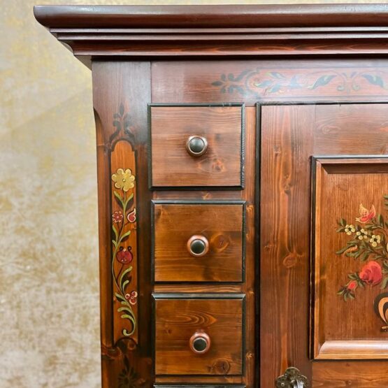 Das dunkle Fichtenholz wurde traditionell von Hand bemalt: Kräftige Blumenmotive zieren die Türfüllungen und Seitenflächen, eingebettet in stilvolle Rahmen mit alpinem Charakter. Sechs schmale Schubladen auf der einen Seite sorgen für Ordnung mit Charme – ob für Wäsche, Tücher oder kleine Schätze.