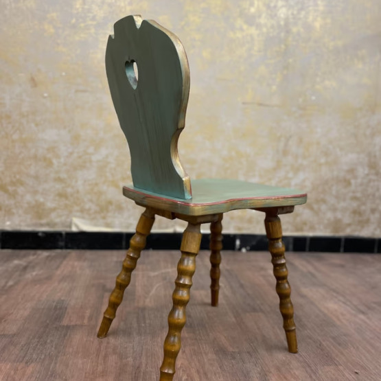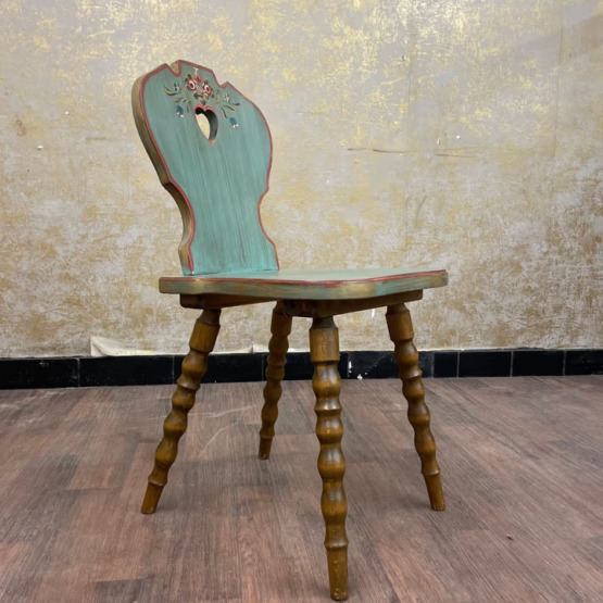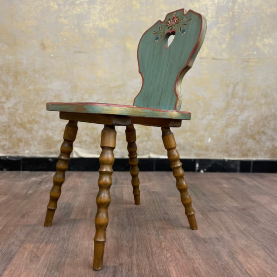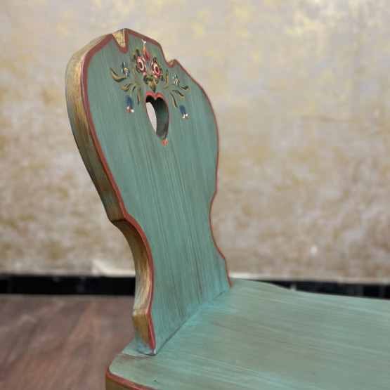 Gedrechselte Beine und die Rückenlehne mit dem typischen Herzmotiv zeigen die hochwertige Verarbeitung. Darüber sorgt eine aufwendig von Hand gemalte Verzierung für eine dekorative Note, die dem Stuhl eine individuelle Ausstrahlung verleiht.