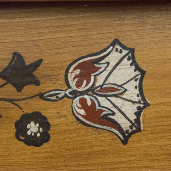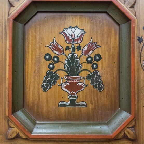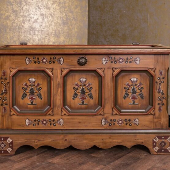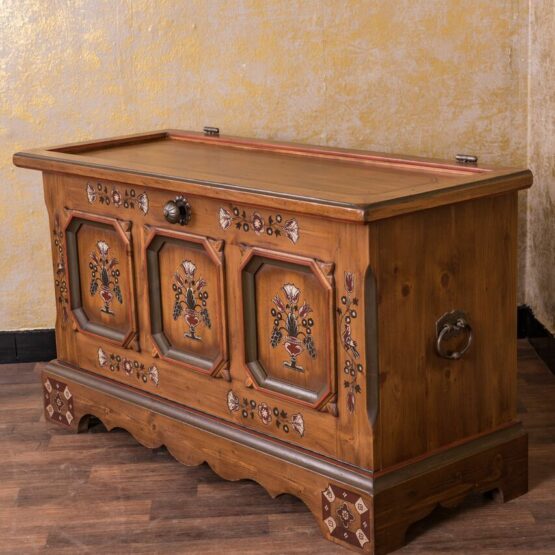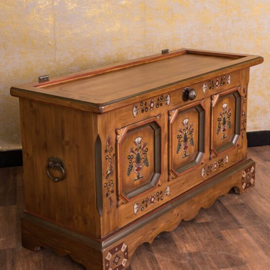 Die handbemalte Oberfläche und die typische Bauernmalerei verleihen der Truhe eine besondere ästhetische Note und machen sie zu einem zeitlosen Blickfang in jedem Raum.