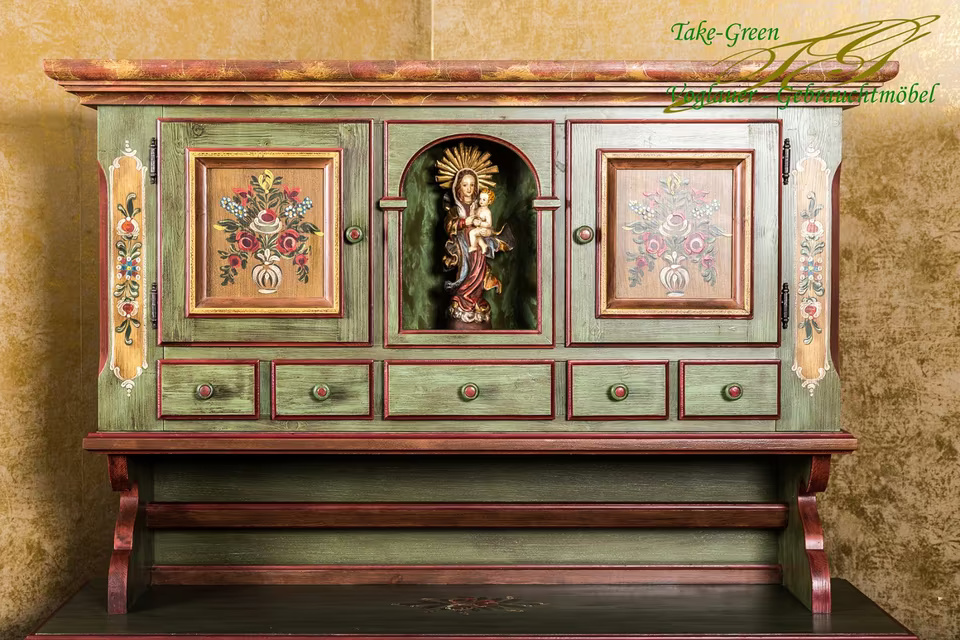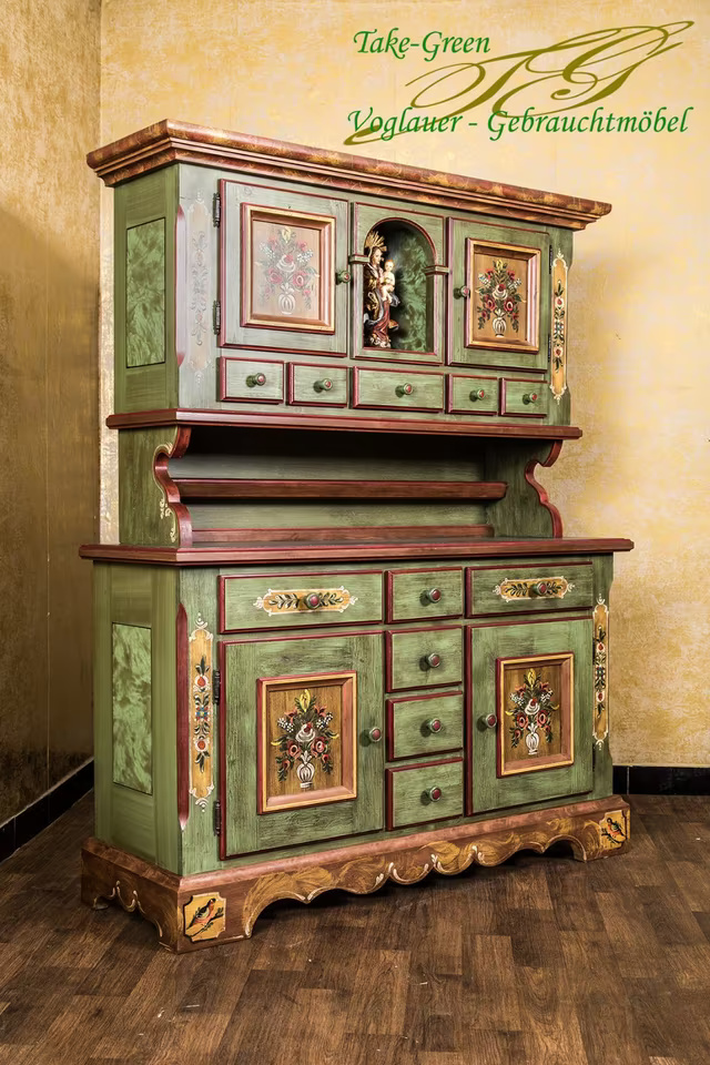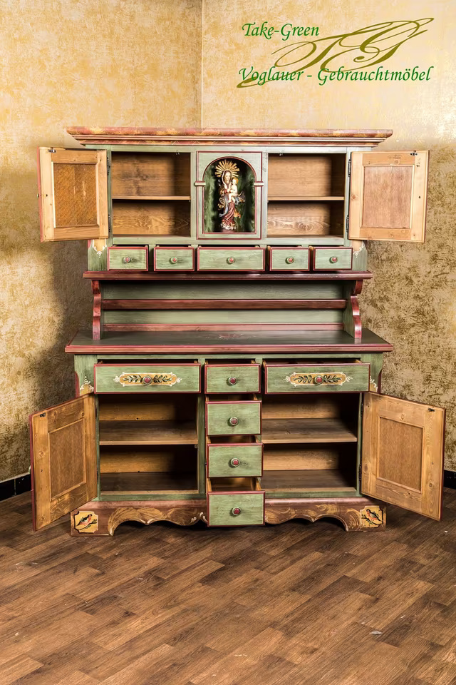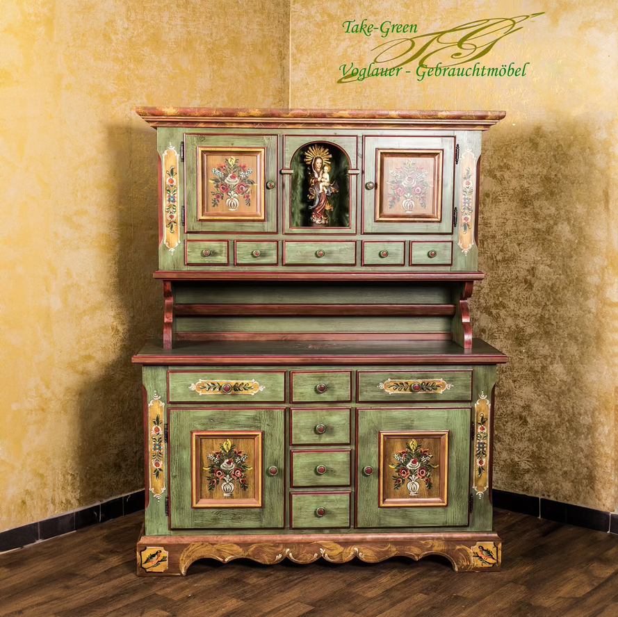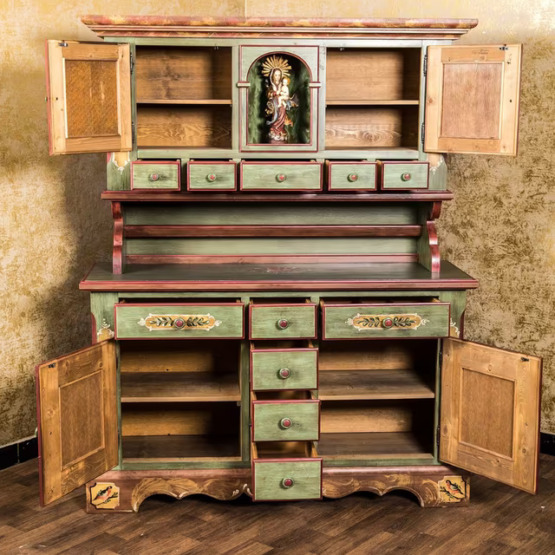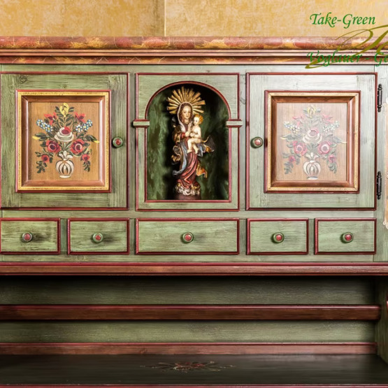 Im Mittelpunkt steht die Madonnenfigur in der mittleren Nische – gerahmt von kunstvoll bemalten Türen mit Blumenmotiven und flankiert von insgesamt 11 Schubladen. Der grüne Korpus mit roten Kontrasten und warmen Holzdetails bringt lebendige Farbigkeit ins Spiel, ohne aufdringlich zu wirken.