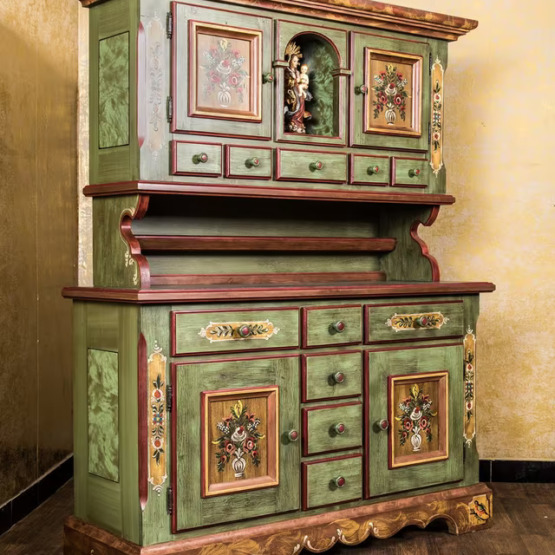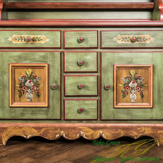 Der geschwungene Sockel, die zarten Malereien und die Vielzahl an Fächern machen dieses Möbel zu einem echten Allrounder – ob als Küchenbuffet, Wohnzimmerschrank oder Andachtsmöbel. Ein Stück Heimat, das bleibt.