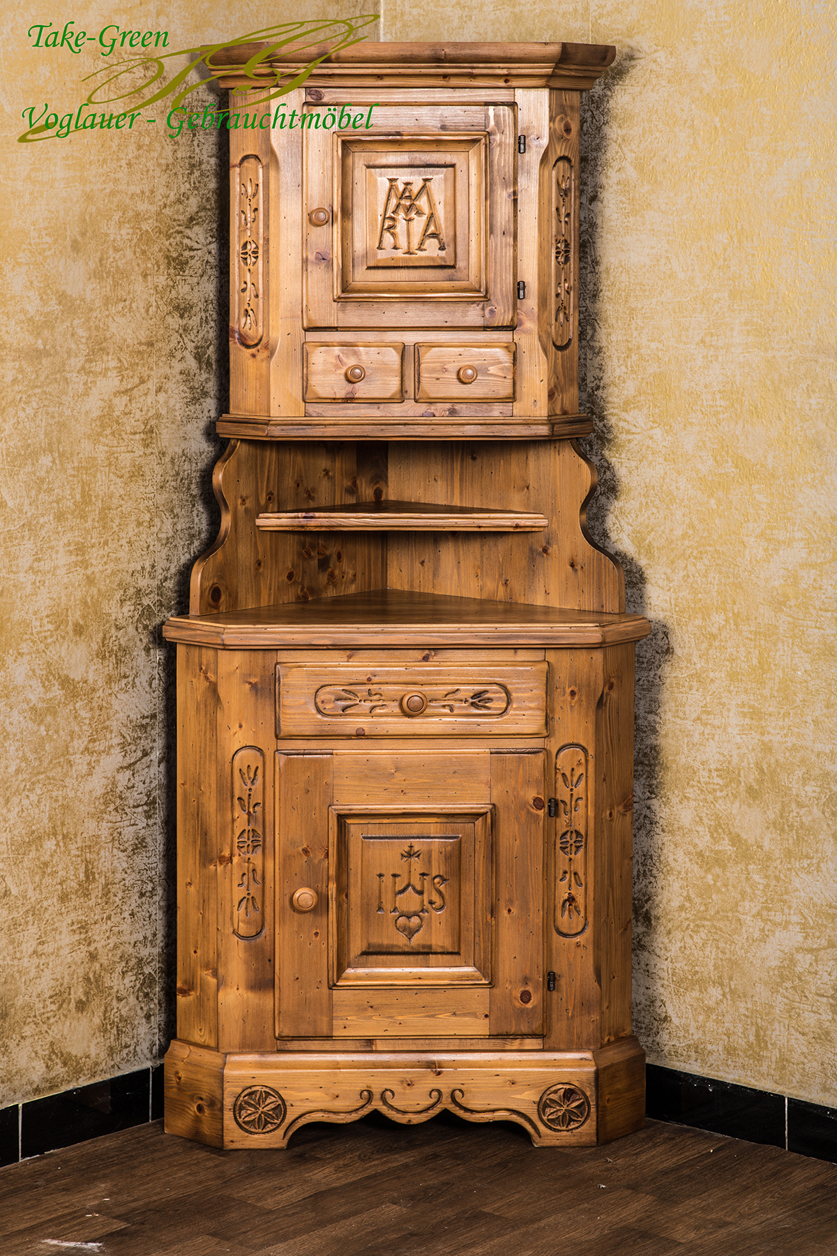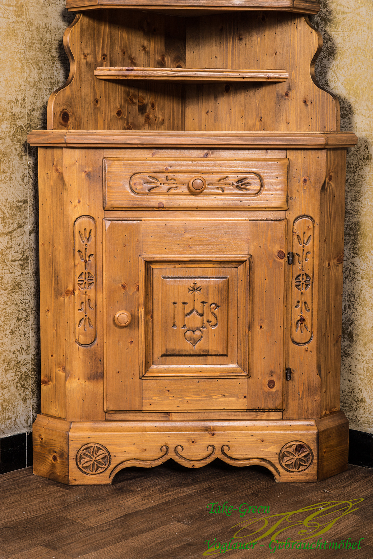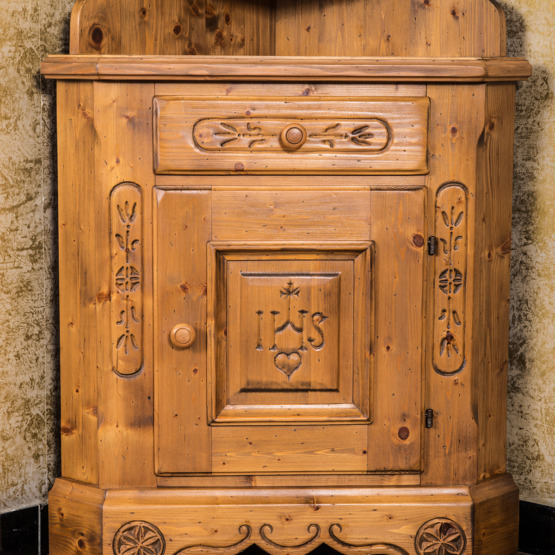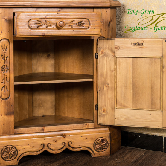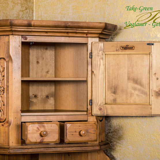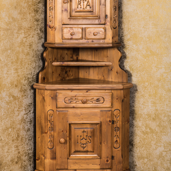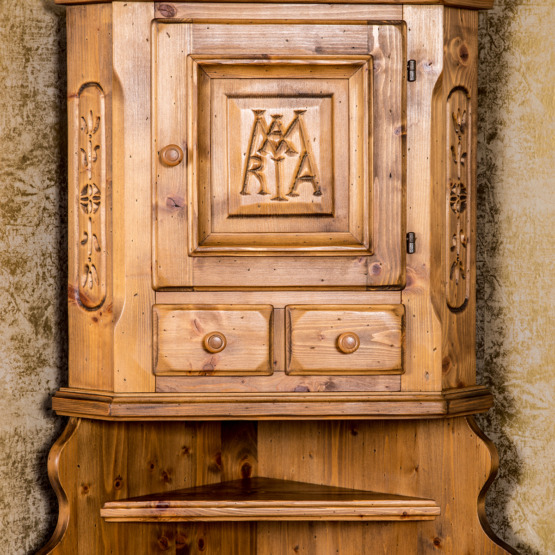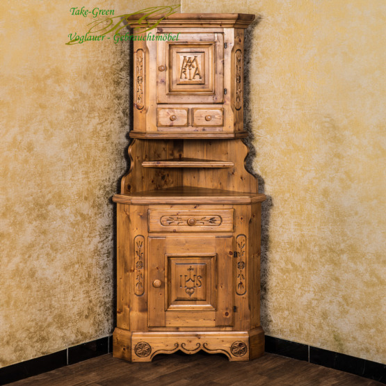 Man spürt die Stille des Alpenraums, wenn man diesem Voglauer Eckschrank begegnet. Gefertigt aus massiver Fichte und mit traditionellen Schnitzereien versehen, erzählt er vom tief verwurzelten Glauben und der Kunstfertigkeit vergangener Generationen.