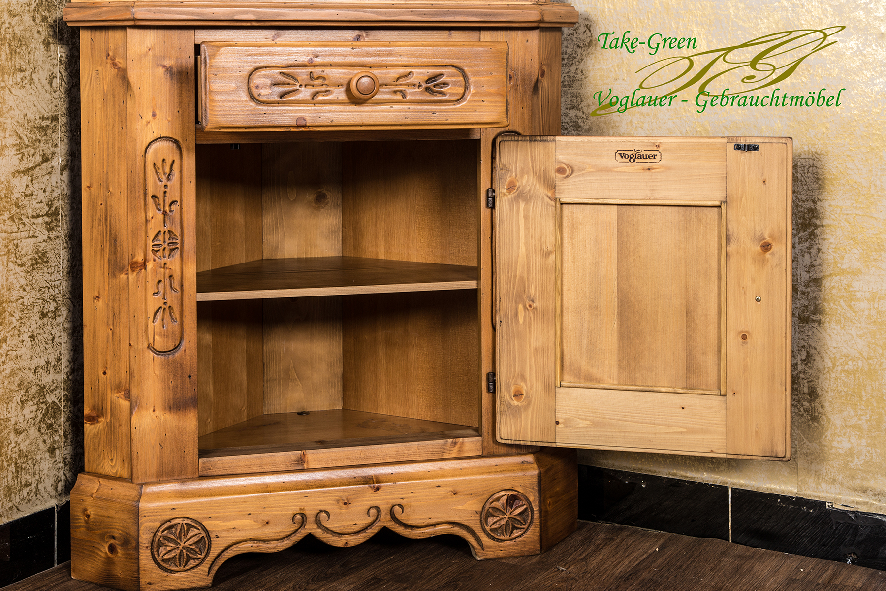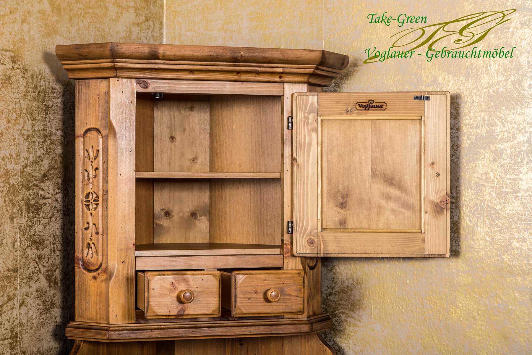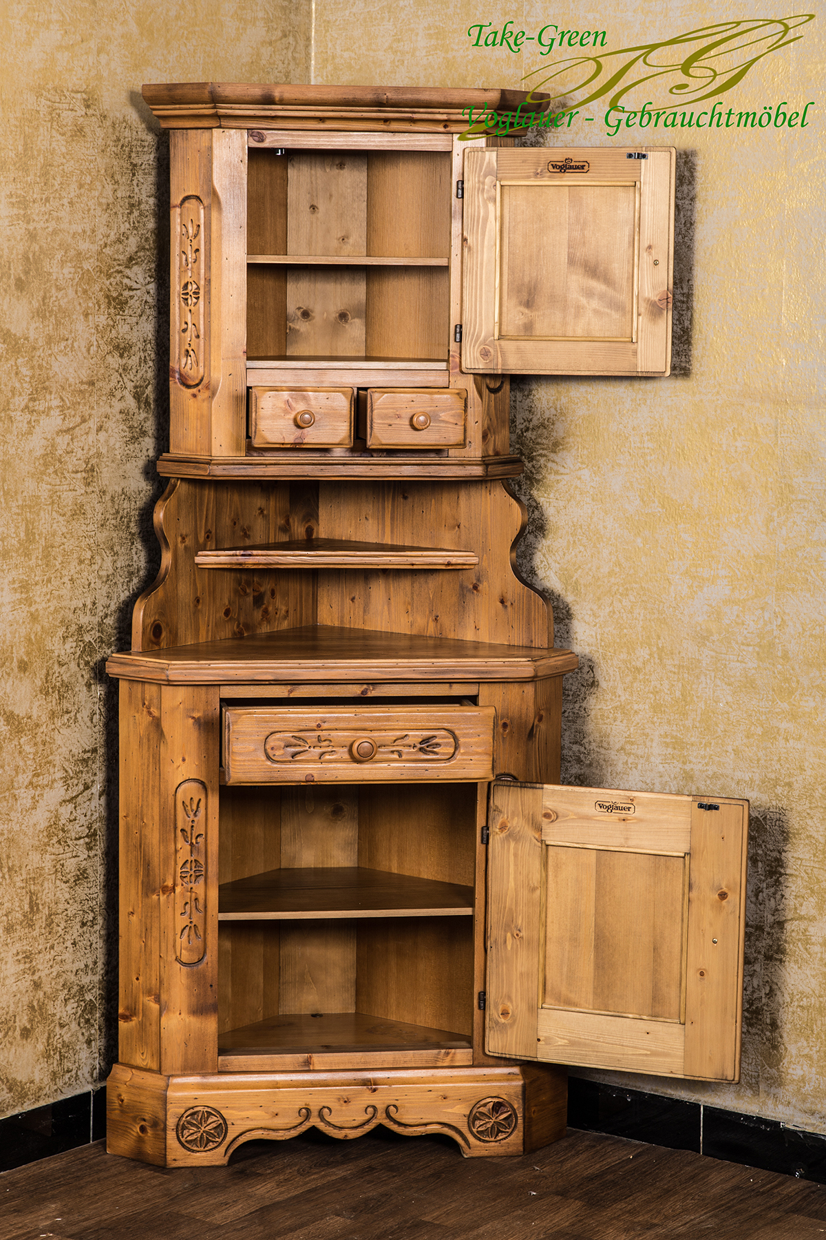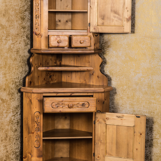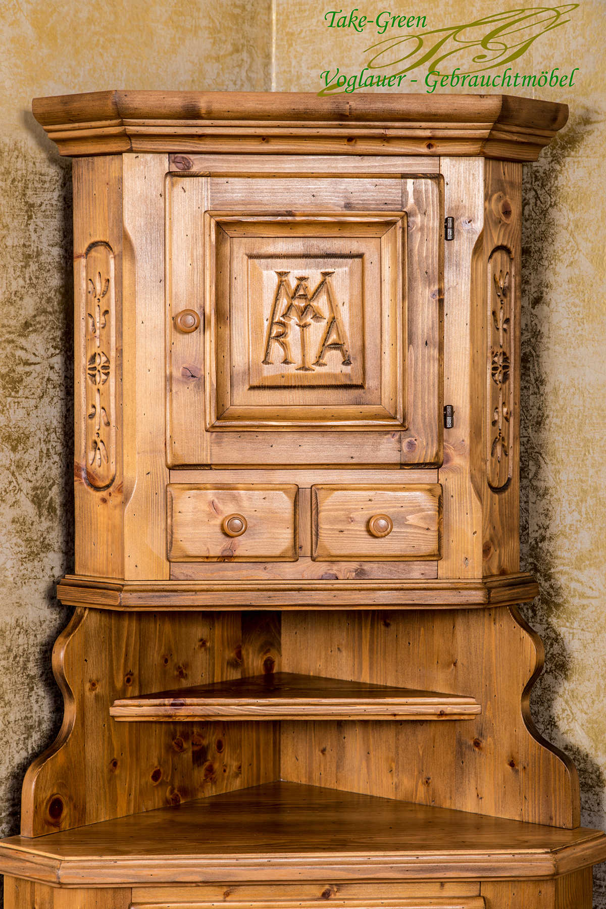 Man spürt die Stille des Alpenraums, wenn man diesem Voglauer Eckschrank begegnet. Gefertigt aus massiver Fichte und mit traditionellen Schnitzereien versehen, erzählt er vom tief verwurzelten Glauben und der Kunstfertigkeit vergangener Generationen.