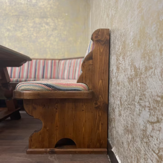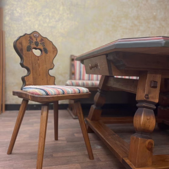 Der Tisch mit seinen gedrechselten Beinen und dem aufwendig gefasten Rand rundet das Ensemble harmonisch ab – ein Ort für Gespräche, Geschichten und gemeinsames Genießen.