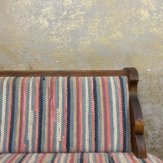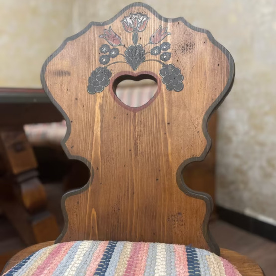 Die Rückenlehnen der Stühle ziert florale Malerei im typischen Stil, die Ausschnitte in Herzform setzen einen verspielten Akzent. Ein echtes Highlight ist der originale Bezugsstoff der Sitzflächen und Lehnen: farbenfroh gestreift, wunderbar erhalten und angenehm gepolstert.