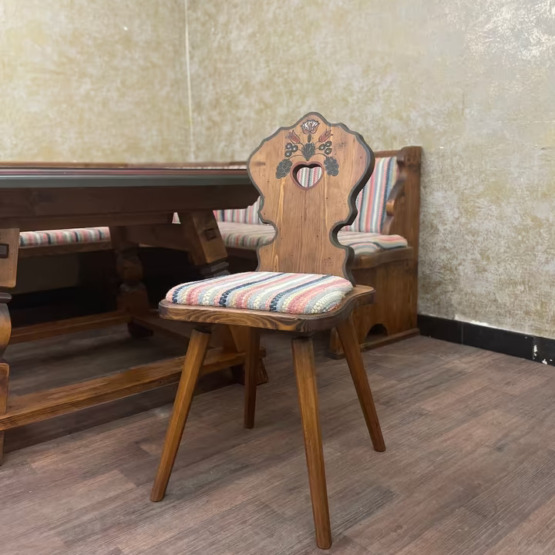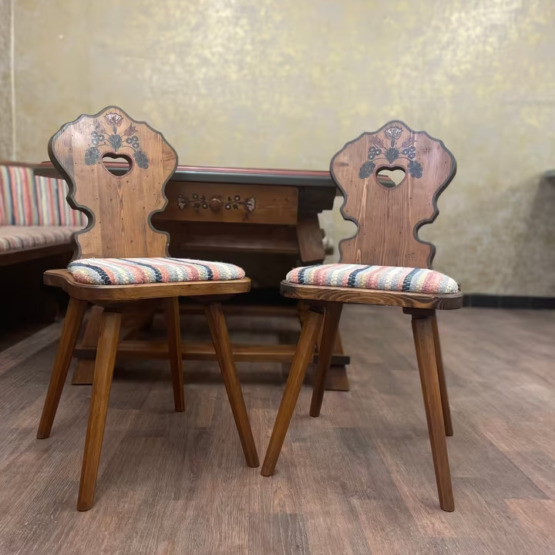 Diese charmante Essgruppe von Voglauer bringt alpenländisches Wohngefühl an den Tisch. Bestehend aus einer gemütlichen Eckbank, zwei Herzstühlen und einem massiven Esstisch, verbindet sie traditionelle Formen mit liebevoller Handwerkskunst.
