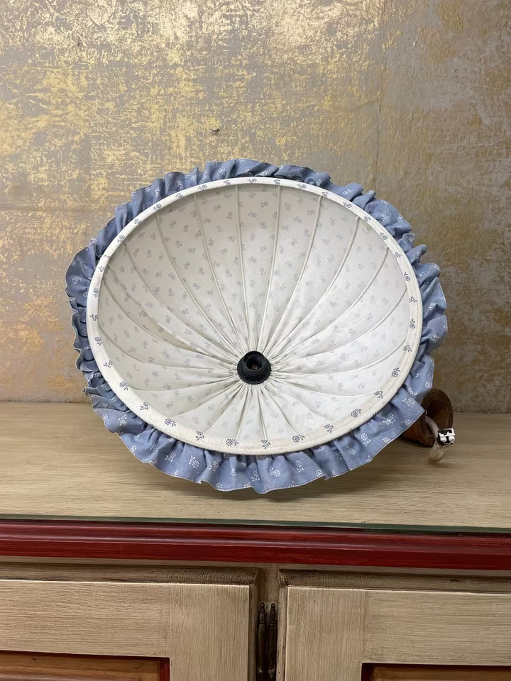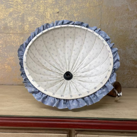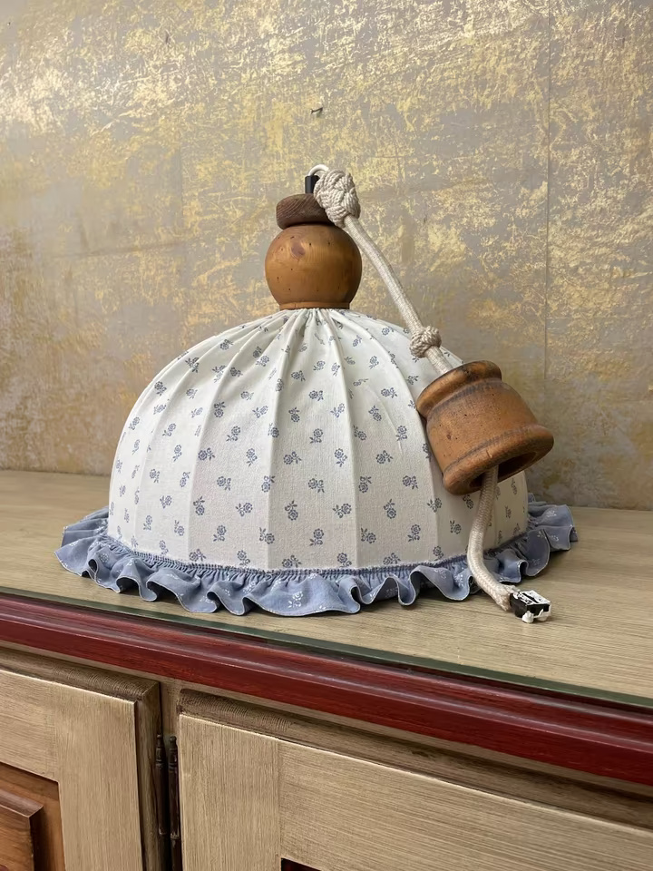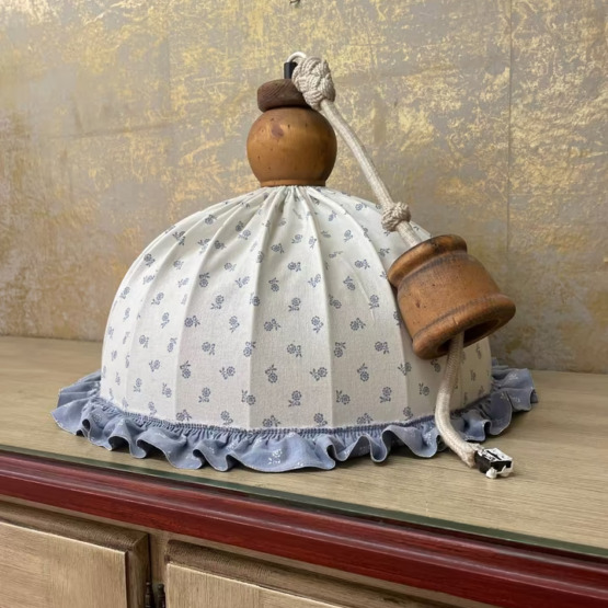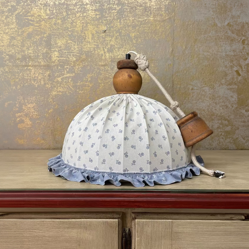 Der halbrunde Stoffschirm mit zartem Blümchendruck und blauer Rüsche ist liebevoll gerafft und strahlt sanfte Wärme aus. Gekrönt wird die Lampe von einem formgedrechselten Holzelement, ergänzt durch ein rustikales Gegengewicht aus Holz und Kordel – ganz wie früher.