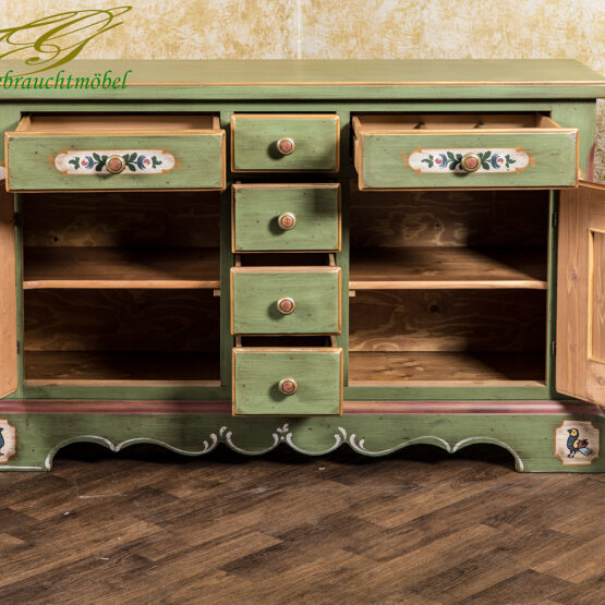 In der Mitte befinden sich vier kleinere Schubladen, auf der rechten und linken Seite jeweils eine größere mit darunterliegender Schranktür, hinter der sich weiterer Platz für Ihre Dinge verbirgt. Diese Kommode von “Voglauer” ist somit eine echte Bereicherung für Ihr Zuhause.